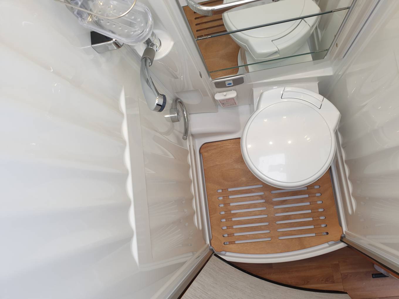 Cassette toilet, a clever foldable sink, a shower with concertina curtain, a