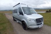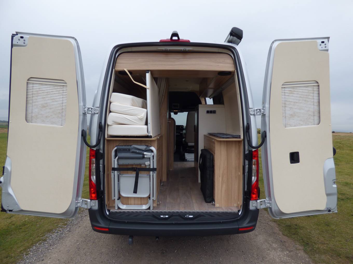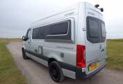 The spacious cab oozes typical Mercedes class with Driver Assistance Package PLUS which in itself contains multiple features including Crosswind Assist and a multifunction media unit including satnav, bluetooth and reversing camera that would be at home in a spaceship. Borbet Alloy wheels, a large Thule awning and 100 litre water tank complete the picture.