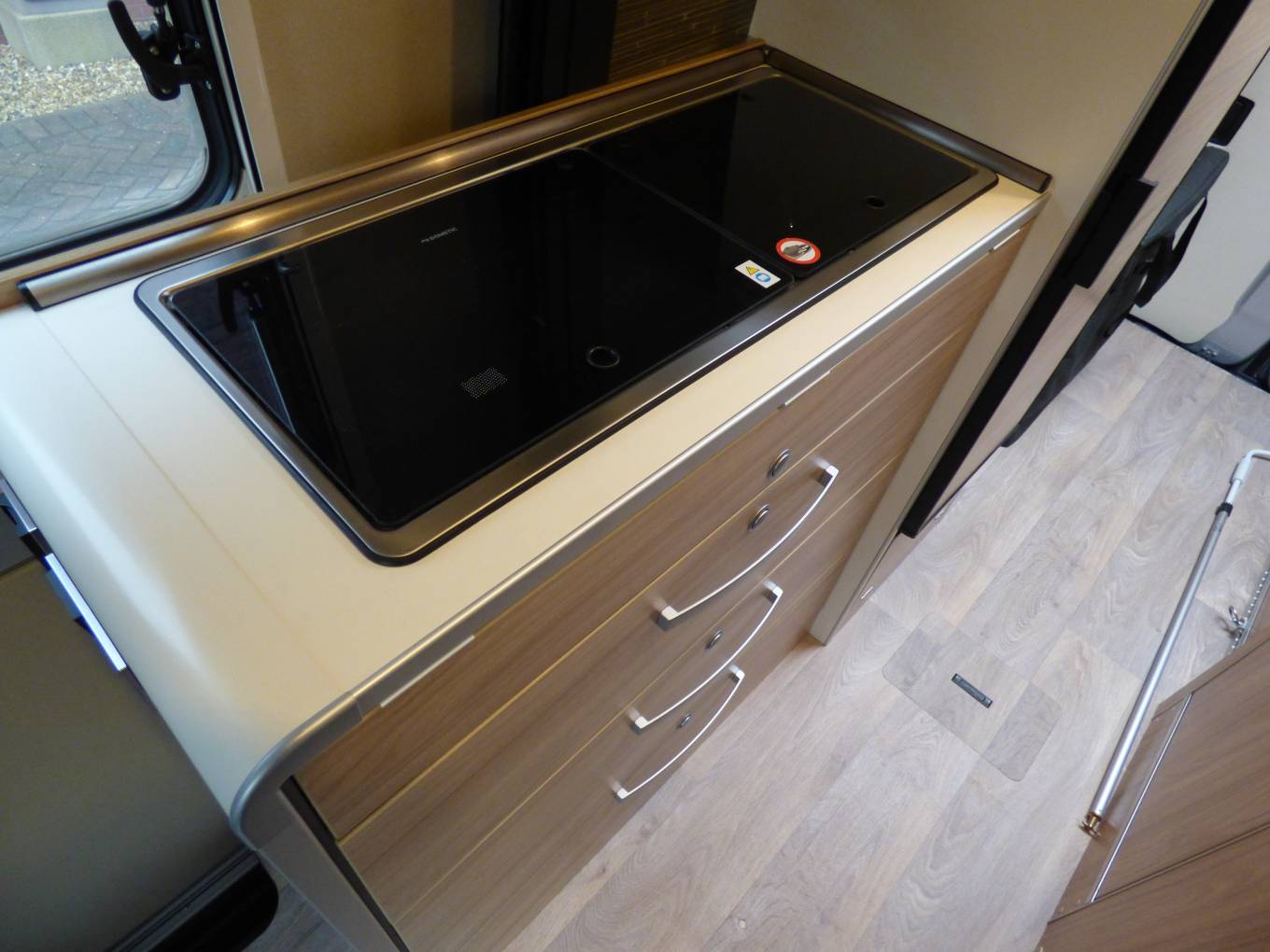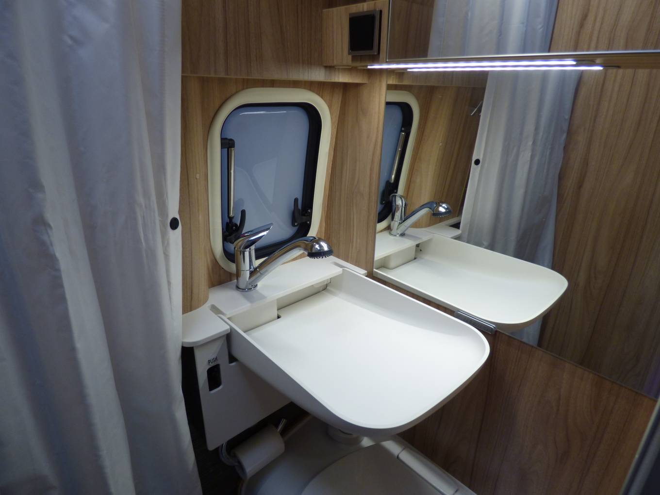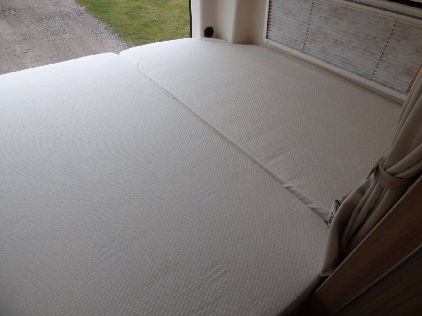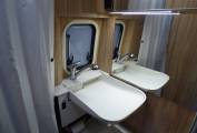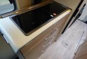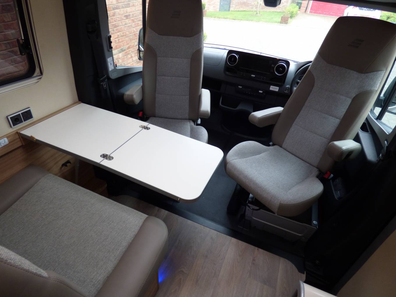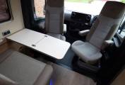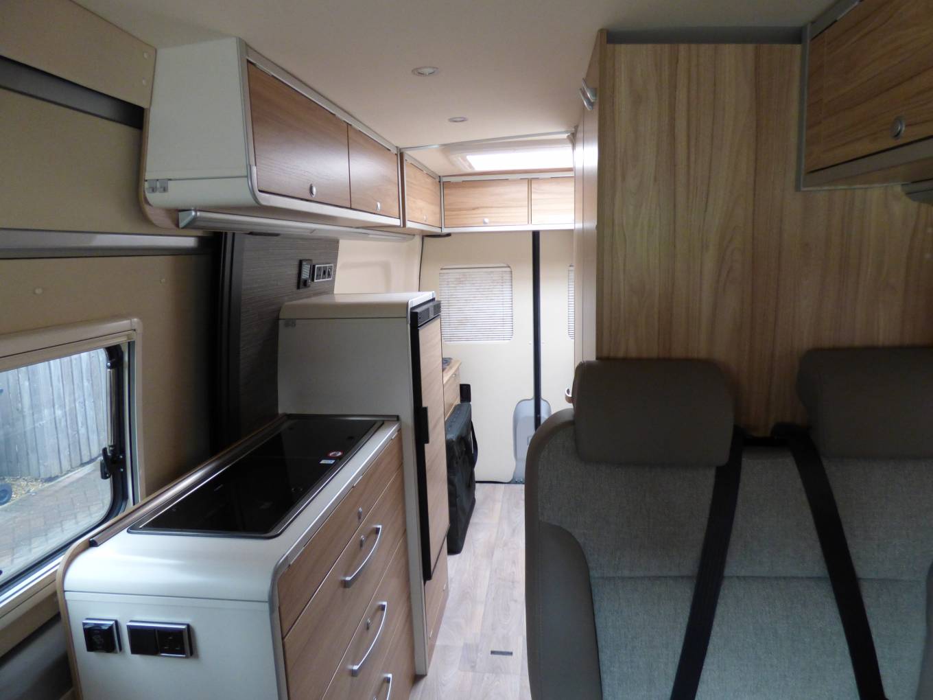 Entry to the vehicle is by the large electric step and large electric sliding door. The 2 berths are found in the raised transverse folding bed at the rear of the vehicle under a large skylight. A partitioning curtain can be deployed to separate the sleeping accommodation from the habitation. There is an extra window with blind in the rear nearside and all windows and skylights have Remis blinds. The kitchen area has a large fridge with removeable freezer, a 2 ring gas hob and sink. The habitation is very cleverly designed to host many lockers and deep drawers providing masses of storage space. The washroom has a folding sink, Thetford cassette w.c. and full height shower with curtain. The front dinette is made up of the two seater with travelling belts and large "Captain" style swivel seats around an extendable table, providing very comfortable accommodation for dining and socialising.