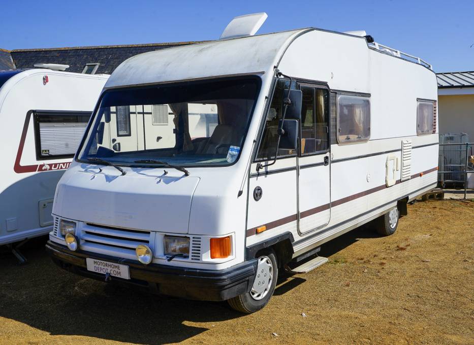 1988 Hymer Solifer 6700, 5 Berth A Class Motorhome with 4 Seat Belts, U Shaped rear Lounge, Drop down Bed over Cab. Very rare Finnish Motorhome built by Hymer to cope with the extremes of weather in Scandinavia; including a wet Central heating system, special insulation & Bofors Double Glazed windows with Blinds and Flyscreens. Fitted with a Wind out Awning, Satellite System, electric step, Microwave, Status TV Booster and aerial, Tow Bar, Inverter, Roof Ladder and Roof bars, Swivel Captains seat and large rear Storage locker.