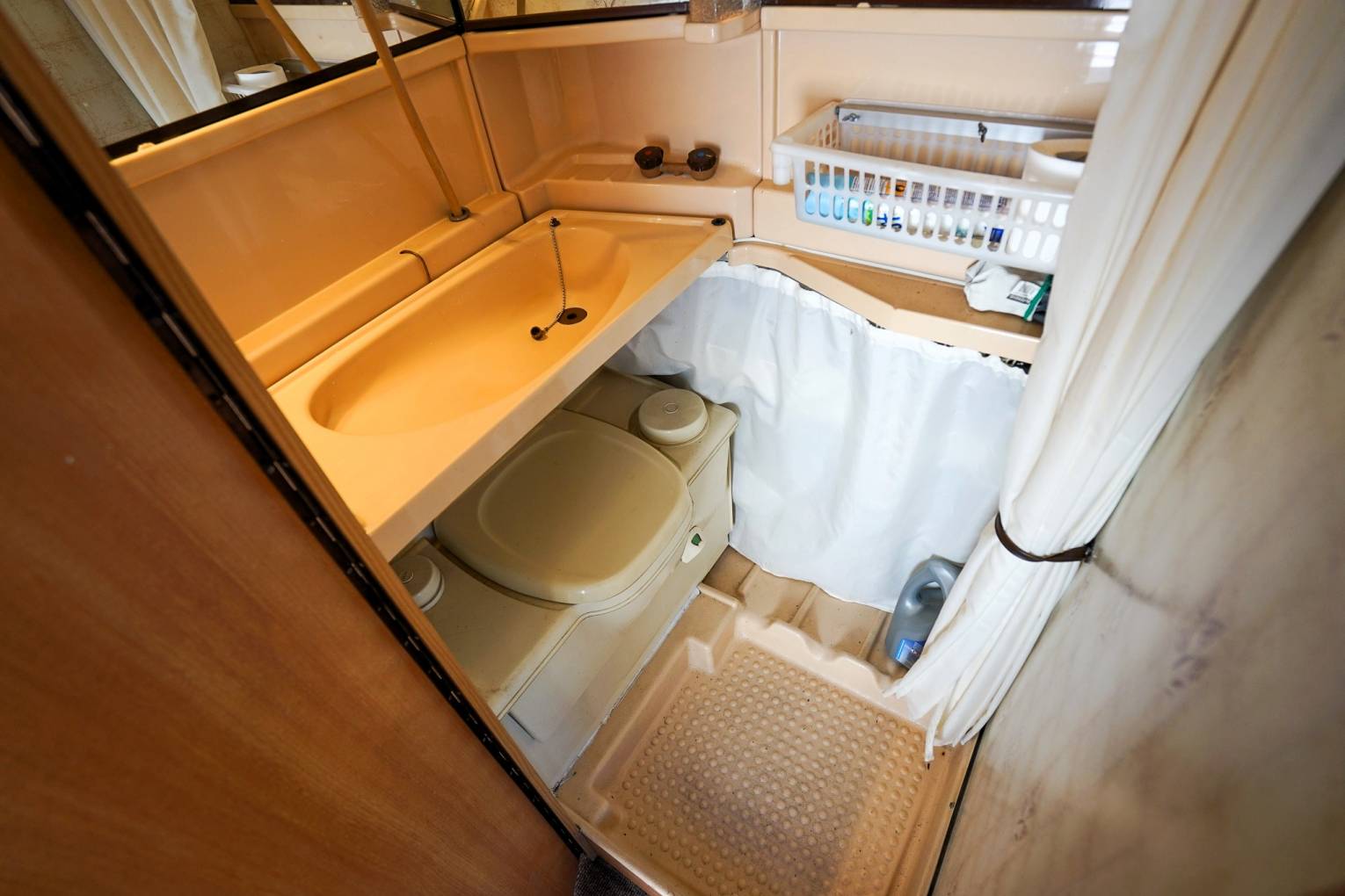 is the washroom with Cassette toilet, foldup wash basin and shower.