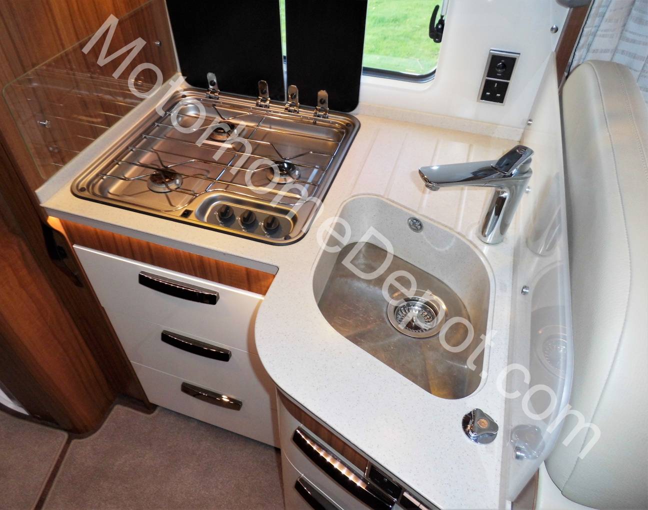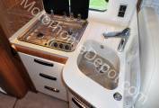 Following on to the offside is the Thule Omnistor wind-out canopy over the habitation door. Entering this door via the electric step and turning left is the large fridge freezer with oven over including grill