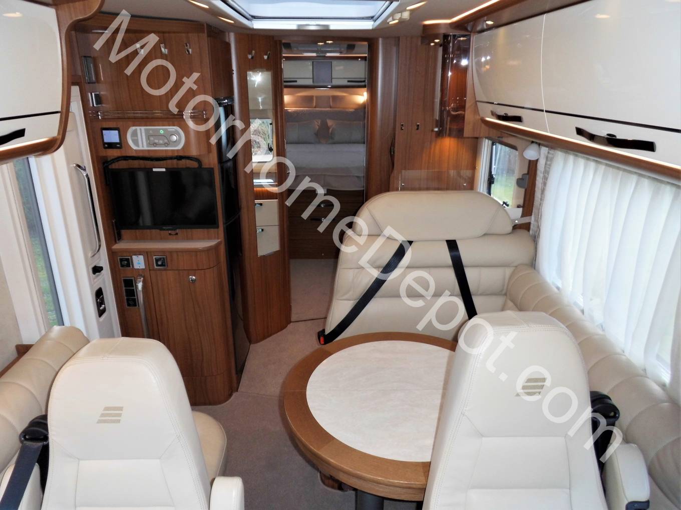 Moving on to the lounge-dining area there is dining for 6 at the premium round and sliding table with real wooden frame. On the right is a single lounge seat and opposite this is the L shaped seat with two forward facing seats fitted with 3 point seat belts. The front seats swivel to accommodate additional dining. There is a flat screen LED TV wall mounted on an extended swivel bracket
