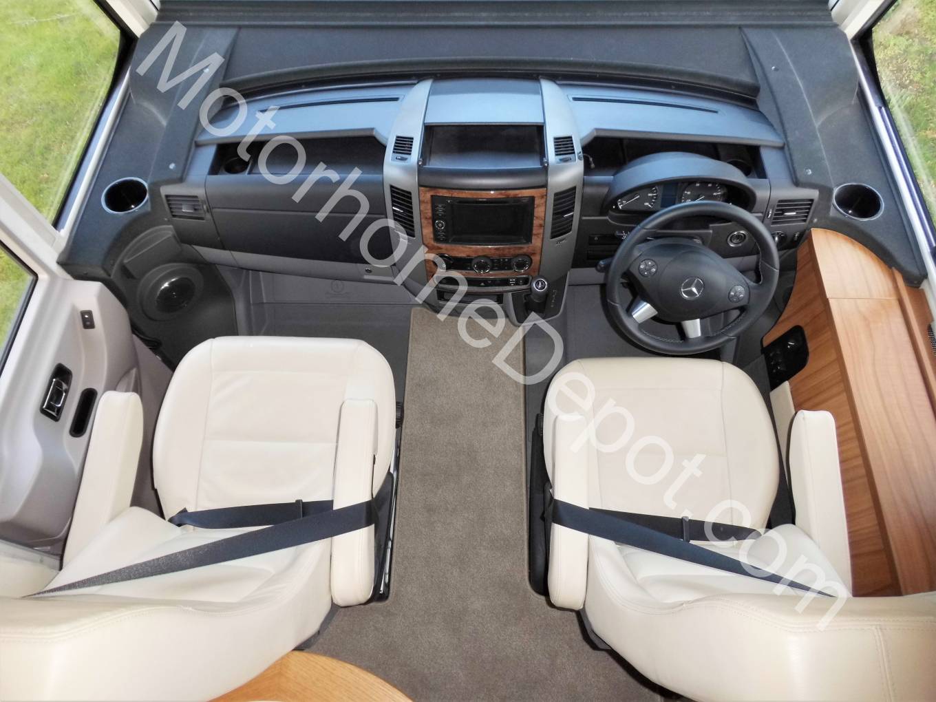 Entering the cab area, the driver and passenger seats are Captain swivel seats which are heated and both have 3 point seat belts. there is cab air con, radio-CD, sat nav and reversing system, electrically operated black out blinds to front and manually operated on both sides