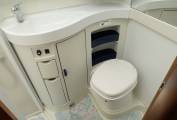 Moving forwards from the rear lounge the lovely washroom is on your left hand side and features a good size shower, a cassette toilet, a wash basin with mixer tap, plenty of bathroom cabinet space and 2 large mirrors. An enormous roof light ensures that this washroom is flooded with light which is very handy for getting yourself ready to go out. Opposite the washroom you have a full length wardrobe with a hanging rail for your clothes.