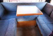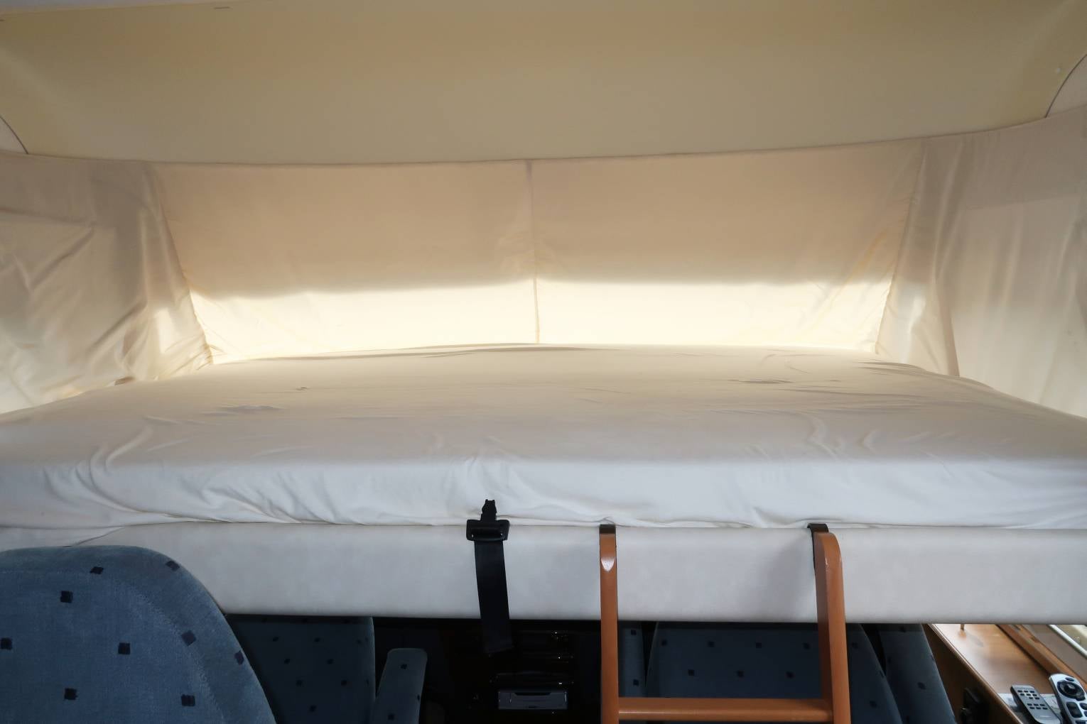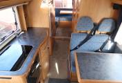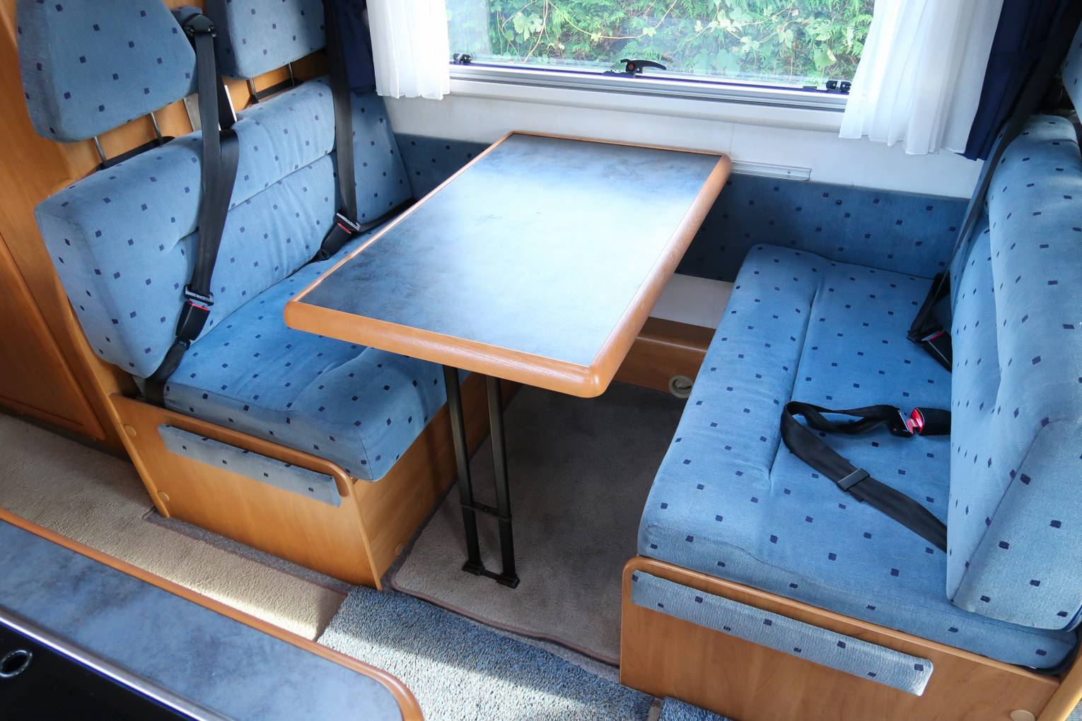 The front dinette features a forward facing two seater sofa fitted with two seatbelts and a rear facing two seater sofa fitted with one seatbelt and one lap belt. There is also a very large solid dining table that four people can sit round at meal times in total comfort. This can be stored away when not in use. Above the cab is a huge pull down bed that measures approximately 76 x 54 inches. Both dinette areas also convert into double beds making up the 6 berths.