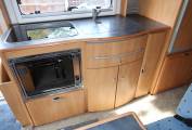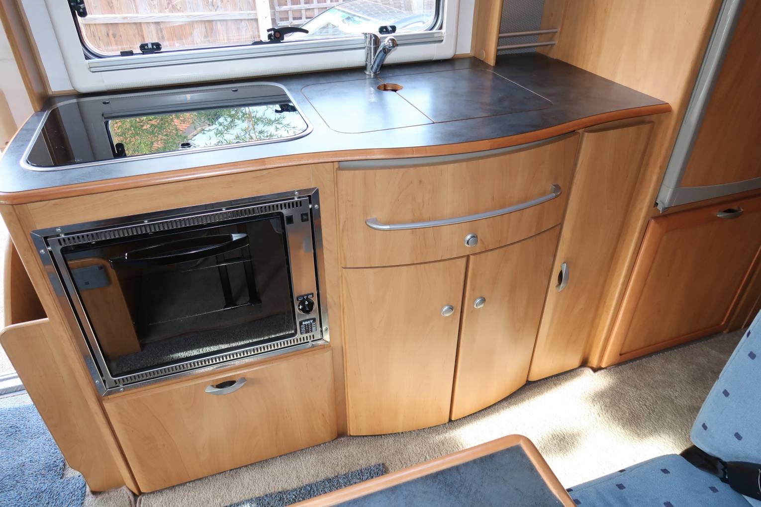 The well equipped kitchen has a three gas burner hob, a gas oven and grill, a three-way fridge with freezer compartment, a sink with mixer tap and unlike many motorhomes a fairly generous worktop area for food preparation. Below the sink is a storage cupboard and some pull out drawers so you have plenty of space to store your pots and pans and cutlery and being a Hymer motorhome the build quality of all the cabinet work throughout the vehicle is of the highest order.