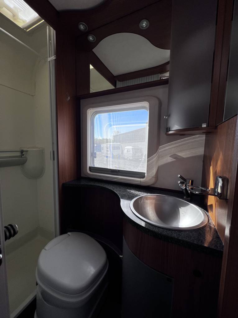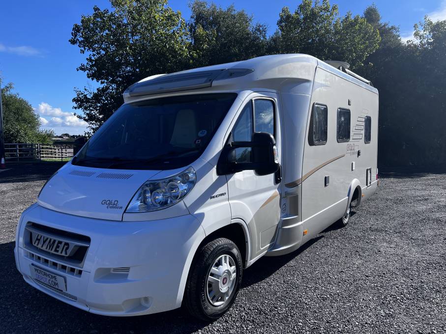 Motorhome Depot and proud to present this extremely rare stunning HYMER T 654 SL GOLD EDITION. This lovely well kept german built motorhome has 4 traveling seat-belts, sleeps 4, features an end bedroom with a French style bed with generous overhead locker storage with a wardrobe and a garage beneath it. Next to the bed area is a spacious washroom with separate shower and toilet with hand-wash basin and vanity mirror.