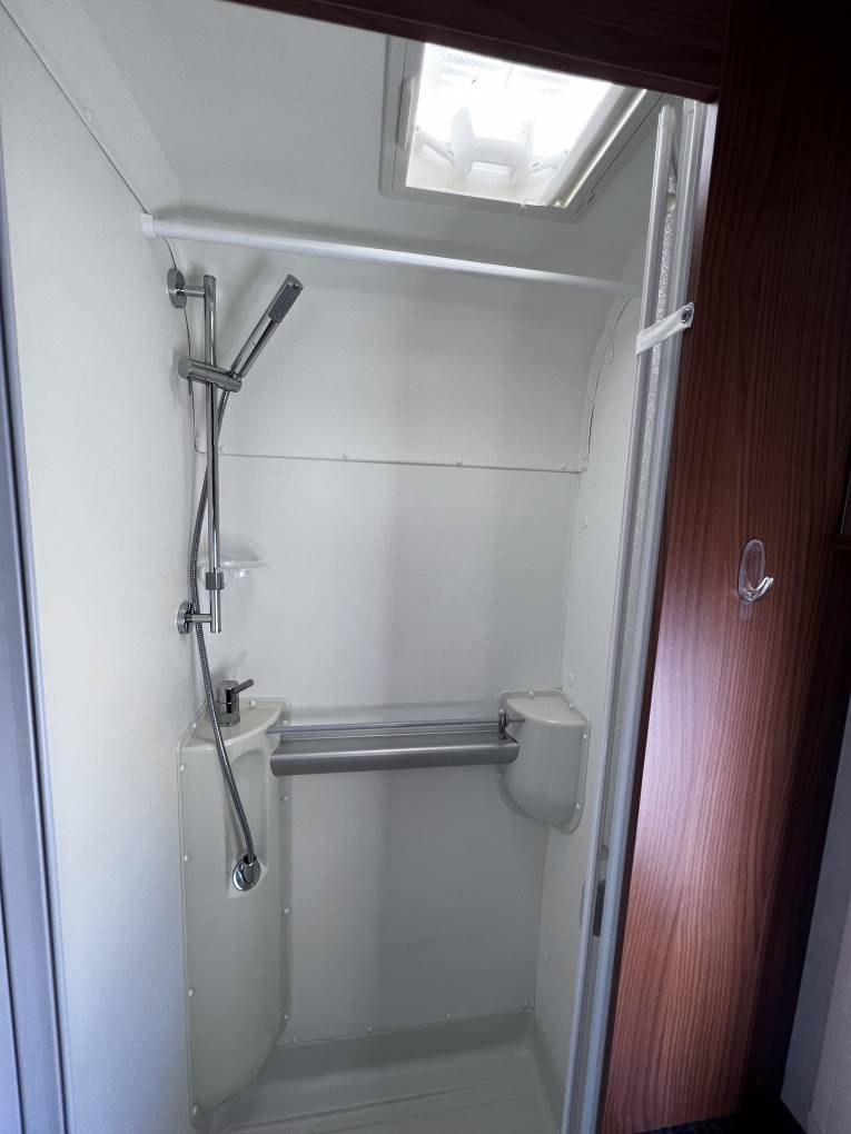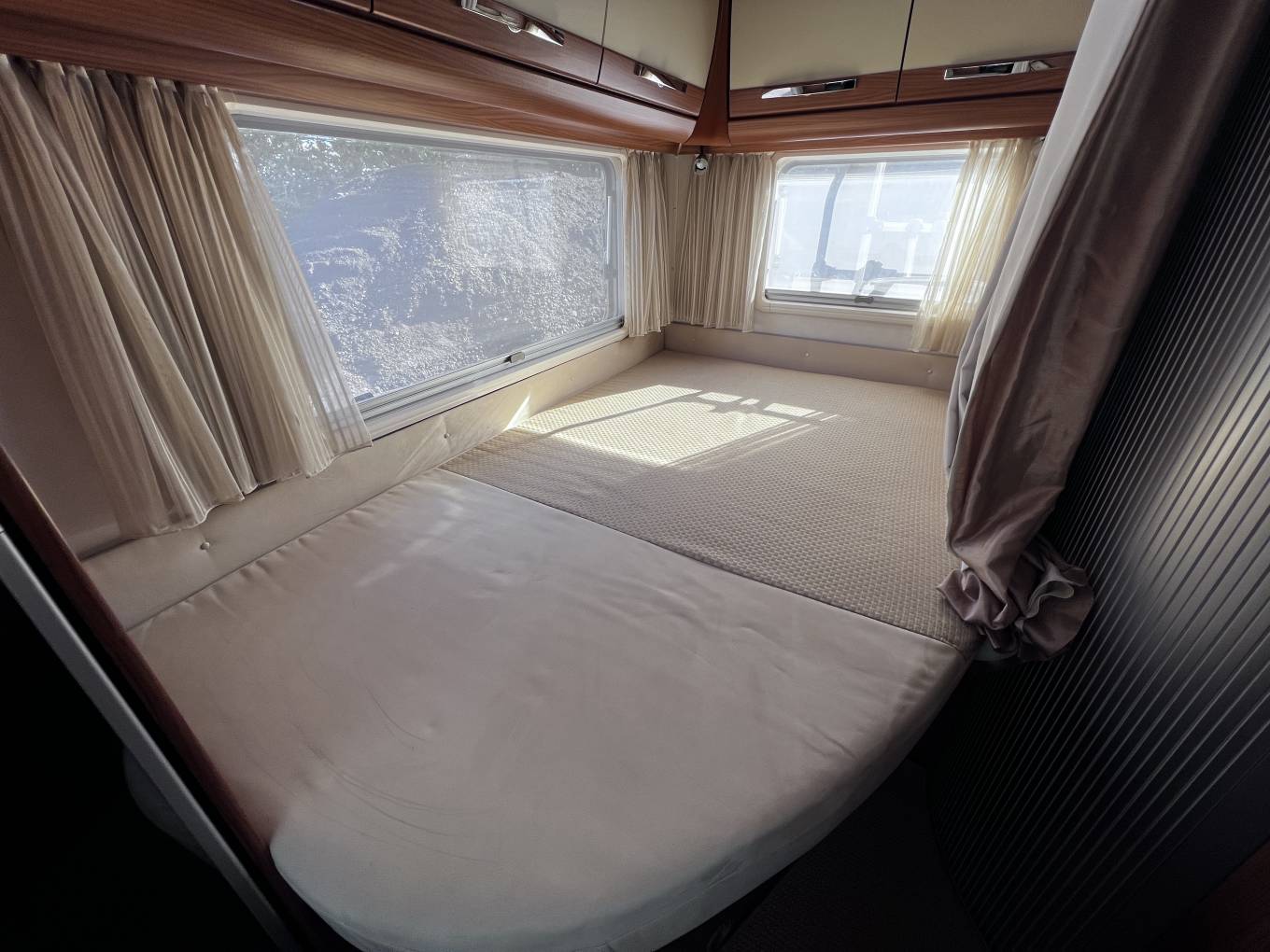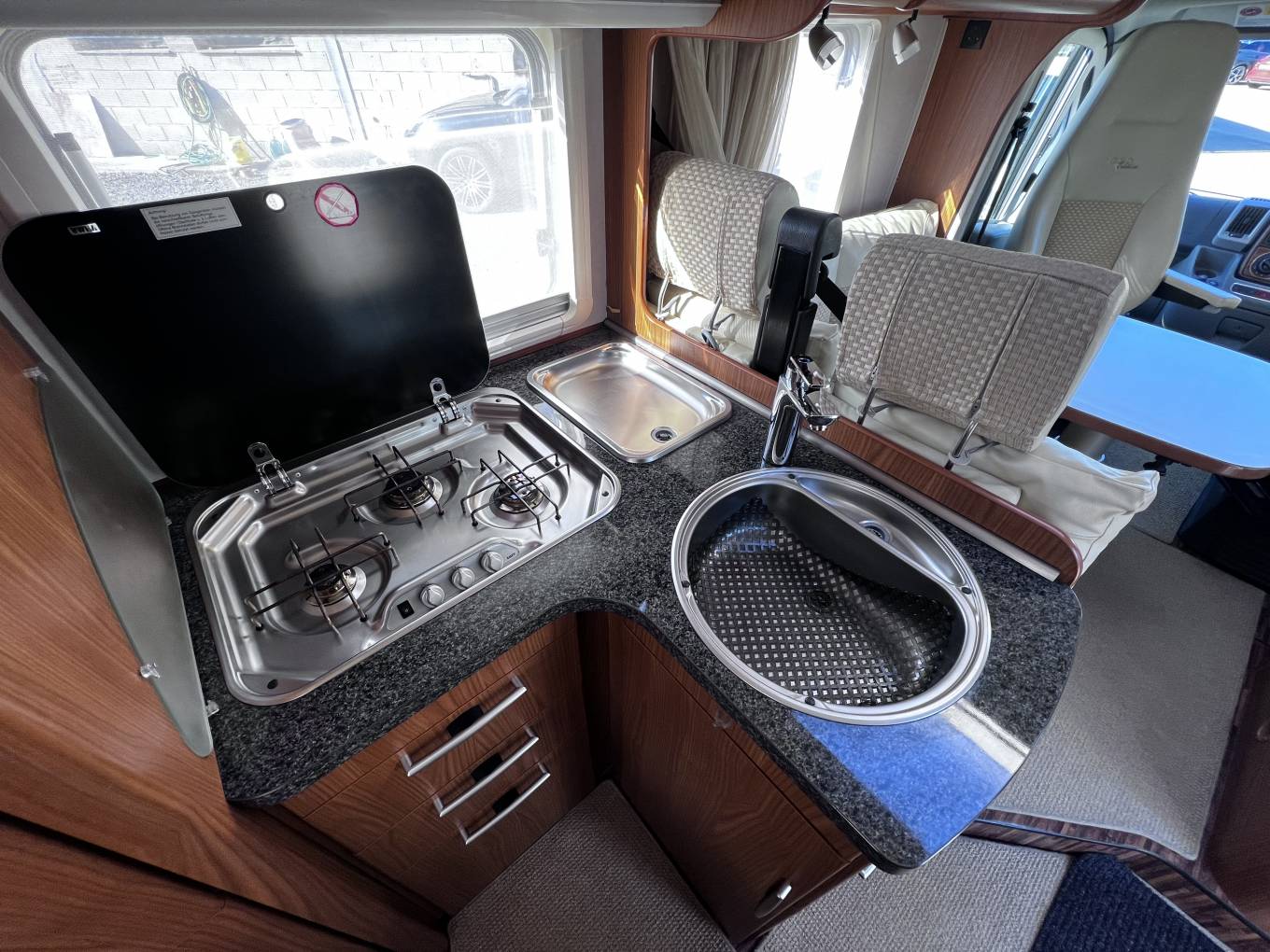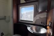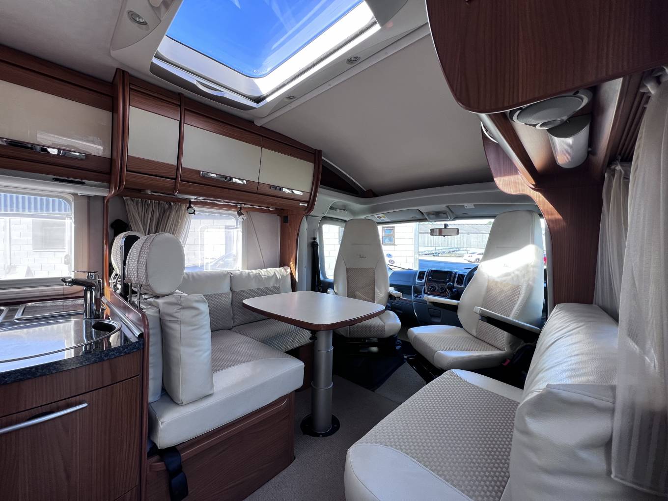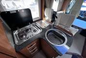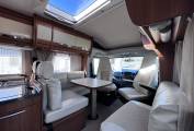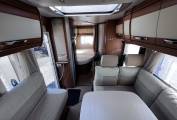 The lounge dinette has 2 forward facing seats with belts and a side facing sofa with dining table and cupboard space and with the 2 front cab seats that will swivel this allows the family to sit around the dining table at meal times. this will convert into a nice size double bed to sleep 2 people comfortably making the 4 sleeping areas. this model also comes with cab air conditioning, cruise control, reversing camera, large wind-out canopy awning, bike rack, scooter carrier for 2 scooters, refillable gas system and sat TV.