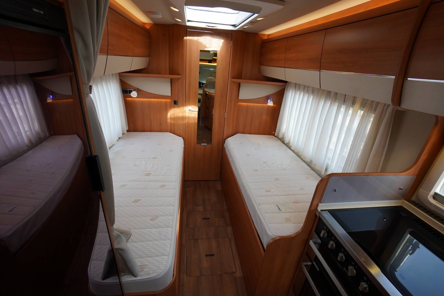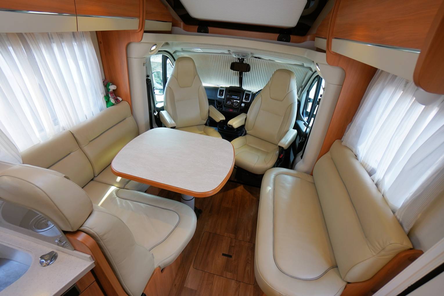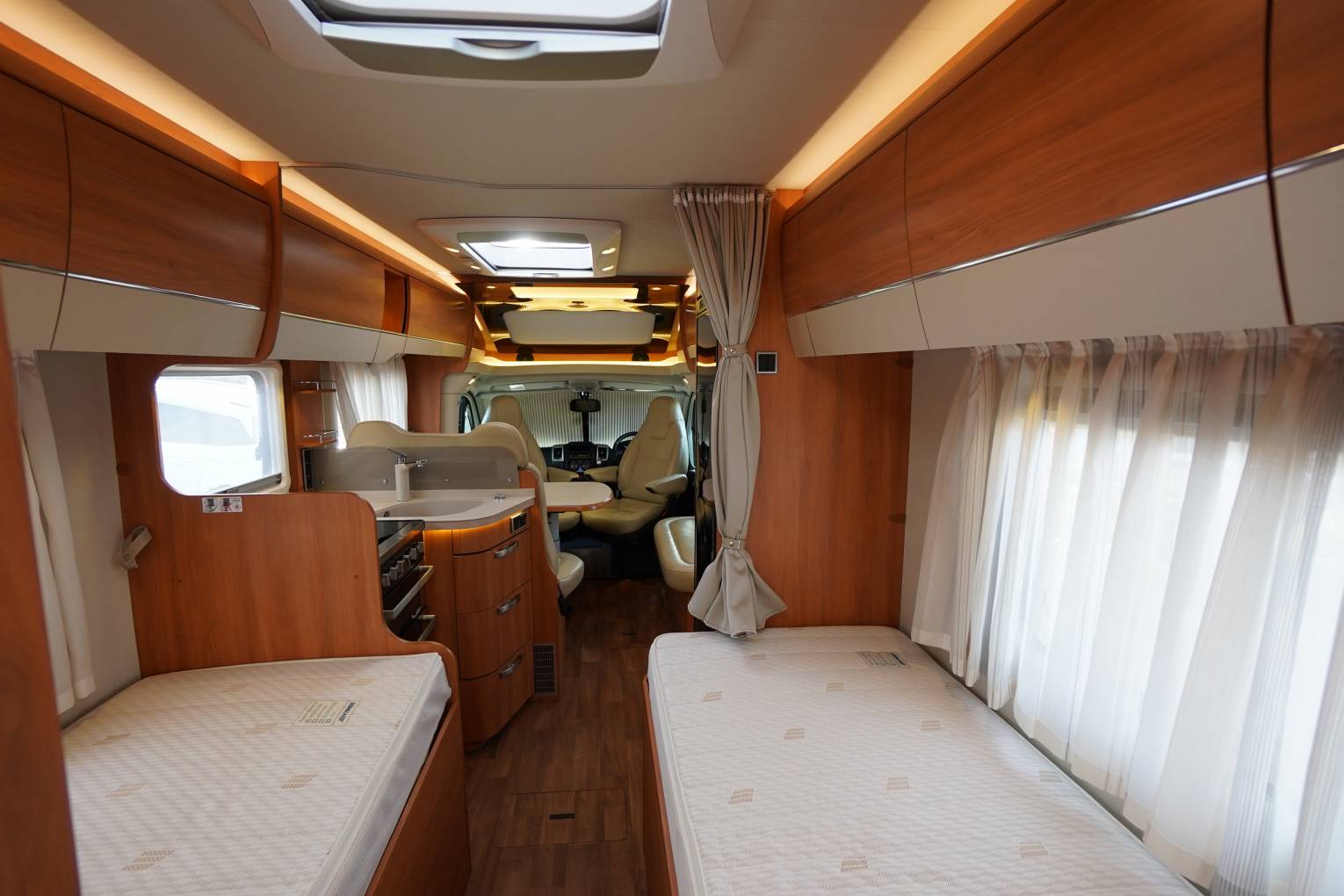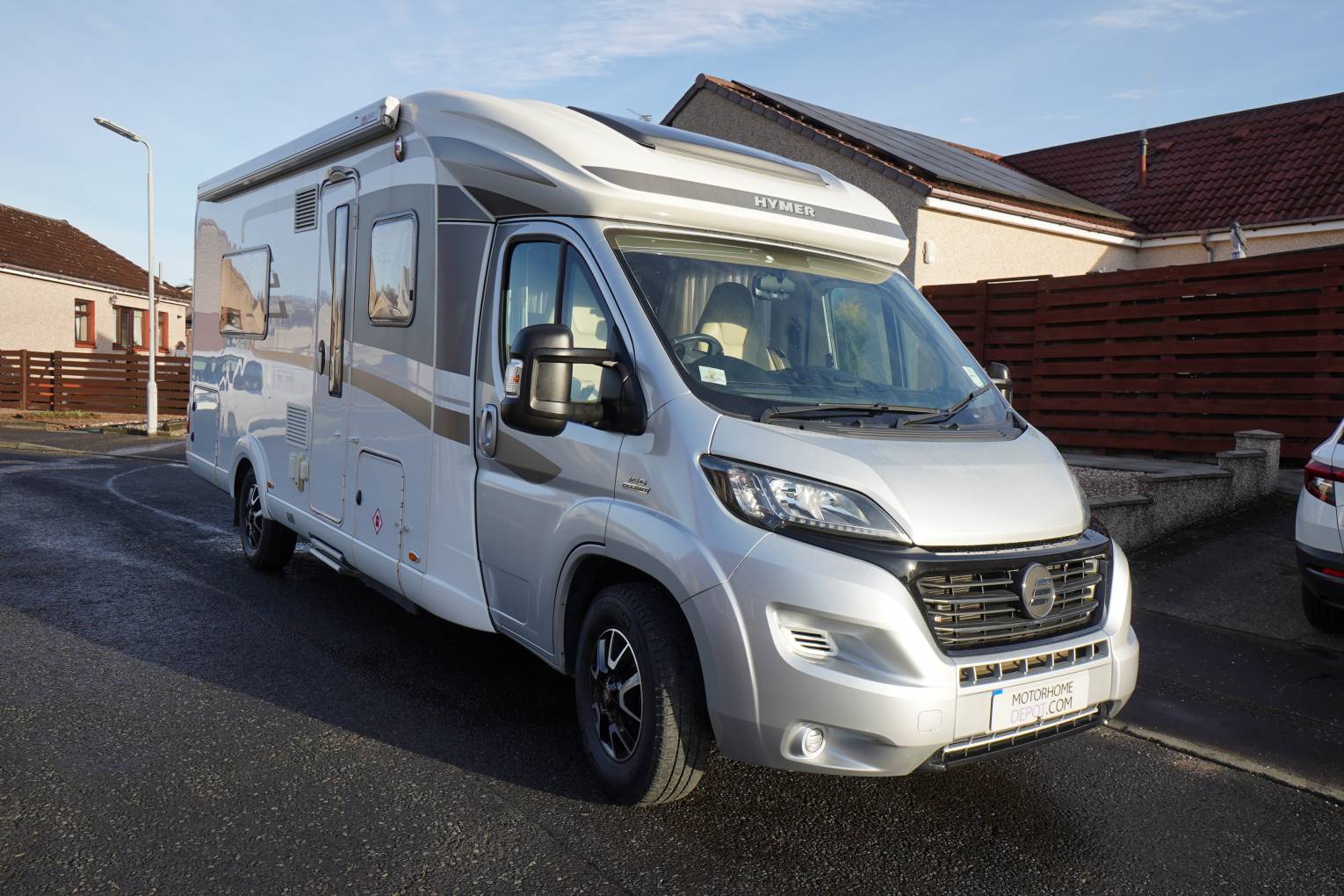 For sale we have this luxury Hymer T 668 SL, low-profile motorhome with 4-berths, 4-seatbelts, fixed single beds and end-washroom. Based on a Fiat Ducato, 2.3 litre, 150hp engine with Comfort-Matic automatic gearbox complete with air-conditioning, cruise-control and reversing / rear-view camera. There are Remis blinds fitted to the cab windows and both the driver and passenger seats swivel into the habitation area.