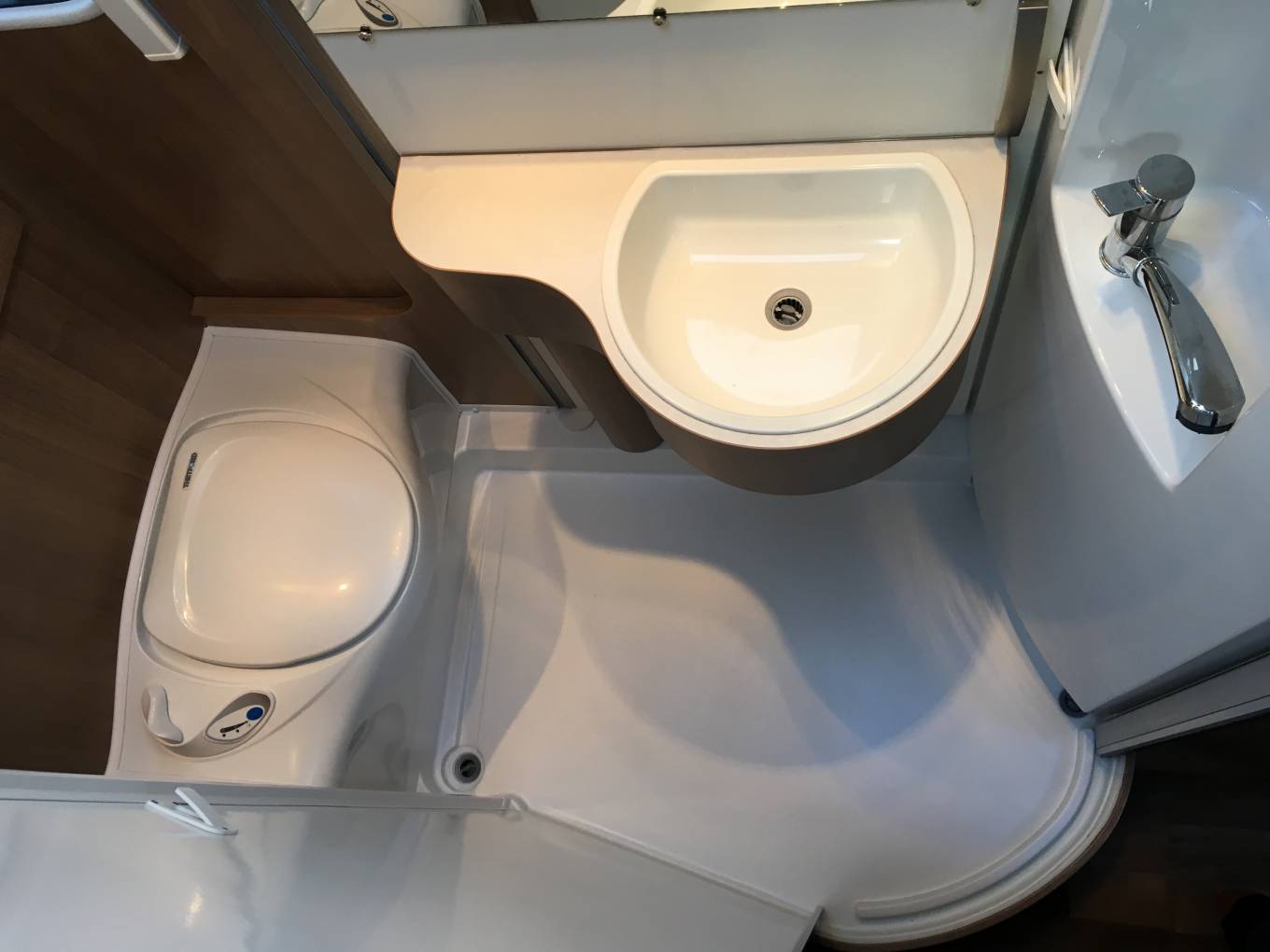 a Thetford bench toilet, a contemporary white washbasin and mixer tap