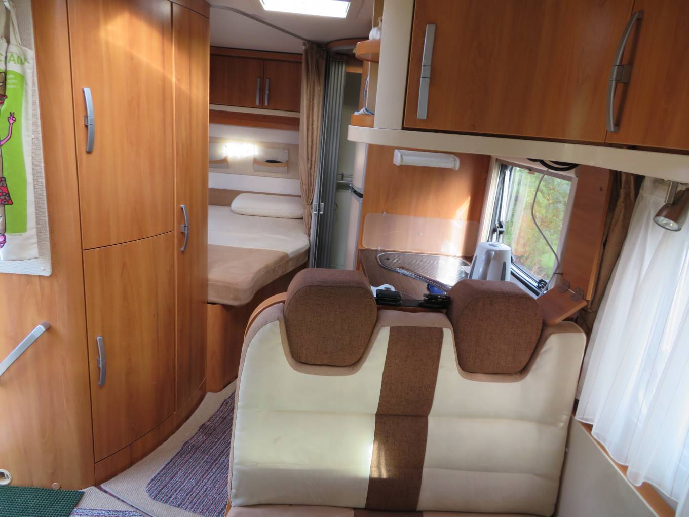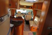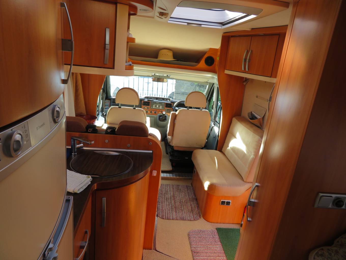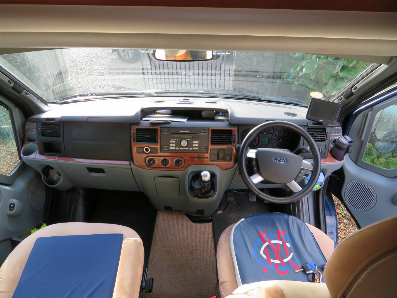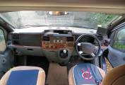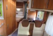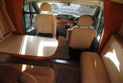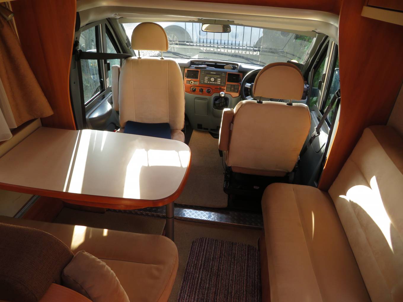To the right is the dinning area which seats 5 once the passenger seat is turned around, the table expands to become full width for dinning, this seating area becomes the second double bed, again lots of storage cupboards around the top, including the bottom opening hatch which allows the TV to drop down out of its concealed cupboard, there is a large opening skylight which allows plenty of light into the area.The cabin area is well equip with cruise control, cabin air-con, alarm and immobalizer, window blinds and electric windows
