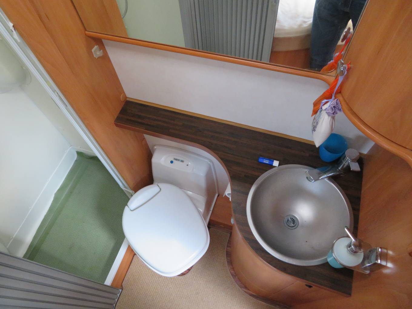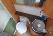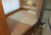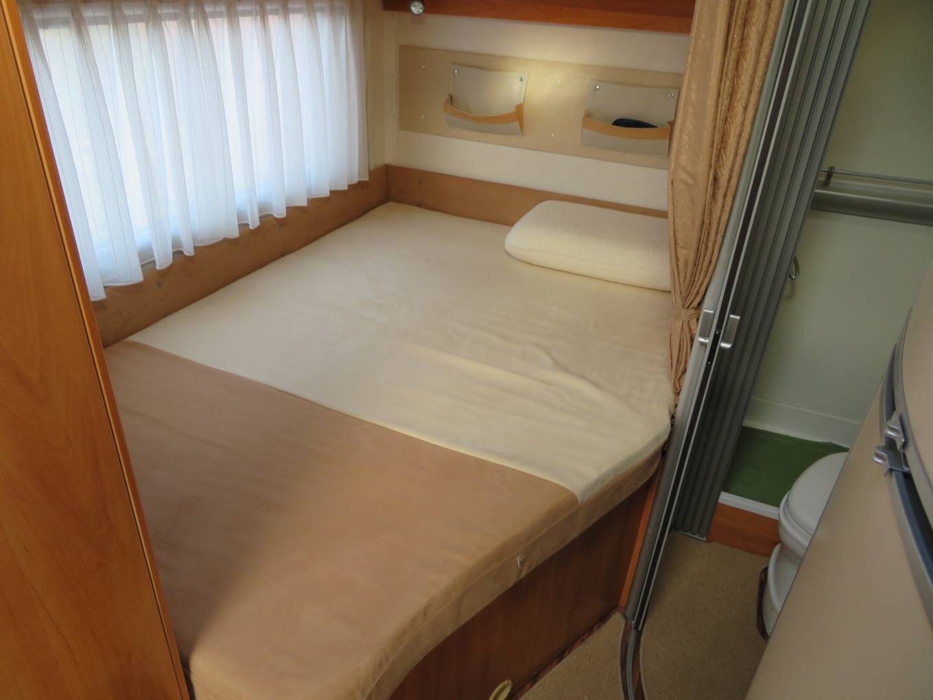 To the left of the kitchen is the fixed rear bed and washroom, the double french bed has a curtain for privacy, lot of high level storage cupboards, a large window, ample spot lights, including 2no reading lights, there is a TV socket along with the heating controls. The wash room has a retractable sliding door for privacy, there is a separate shower enclosure with a folding door, cassette toilet and wash hand basin, cupboard above and below including a large mirror, a small roof light for ventilation.