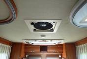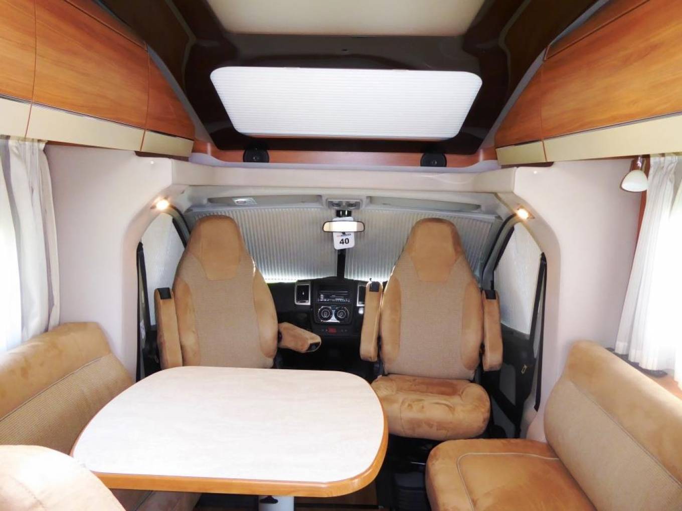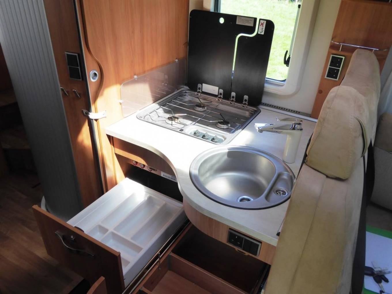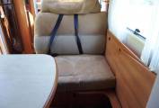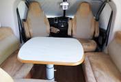 Central kitchen area featuring a large fridge freezer, oven, grille, sink and ample cupboards and drawers. The front lounge area can seat and dine 7, utilising the front swivel seats. The area converts to a double bed when required, and has 2 rear belted seats, with storage below.