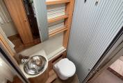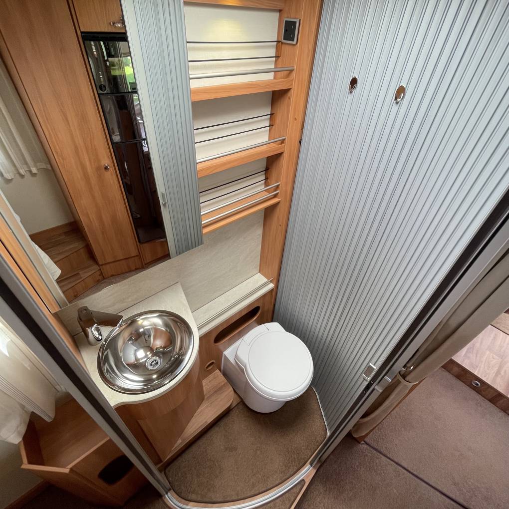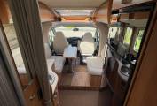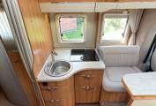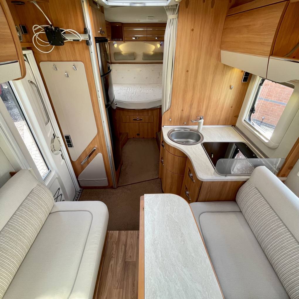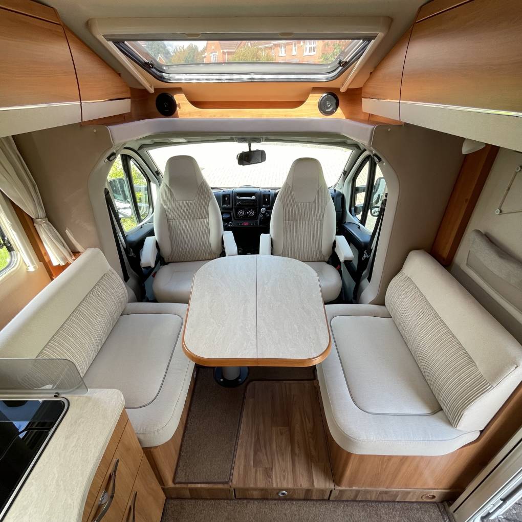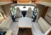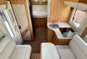 Moving inside this luxurious motorhome you immediately get a very light and spacious feeling with the light upholstery, light wood and lots of windows. To the rear you have an island bed, separate shower cubicle, lots of great storage and also a washroom. Centrally you have your kitchen space which comes complete with a large 3 way fridge freezer, oven and grill, sink with taps and gas hob. Finally in your main living area you have 2 bench seats with an adaptable table and 2 captains seats to allow you to really open out this area. You also have 2 additional seatbelts in this area therefore allowing you to travel with 4 people in total.
