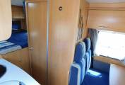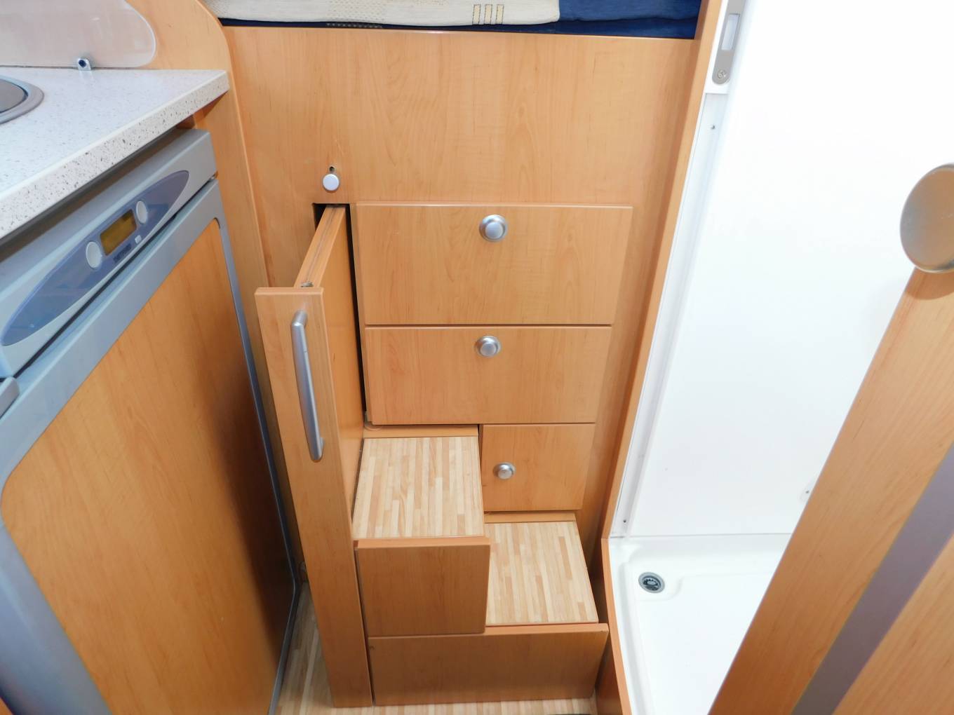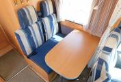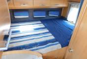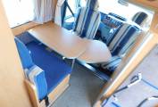 The main feature is the large transverse fixed double bed that can accommodate the tallest of adults, a comfortable mattress, privacy curtains, a window plus a roof vent provide natural daylight. Upper aircraft style lockers for storage and a clever slide out step to assist in accessing the bed.
