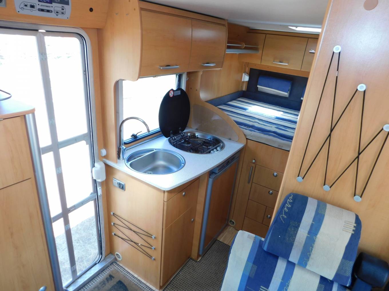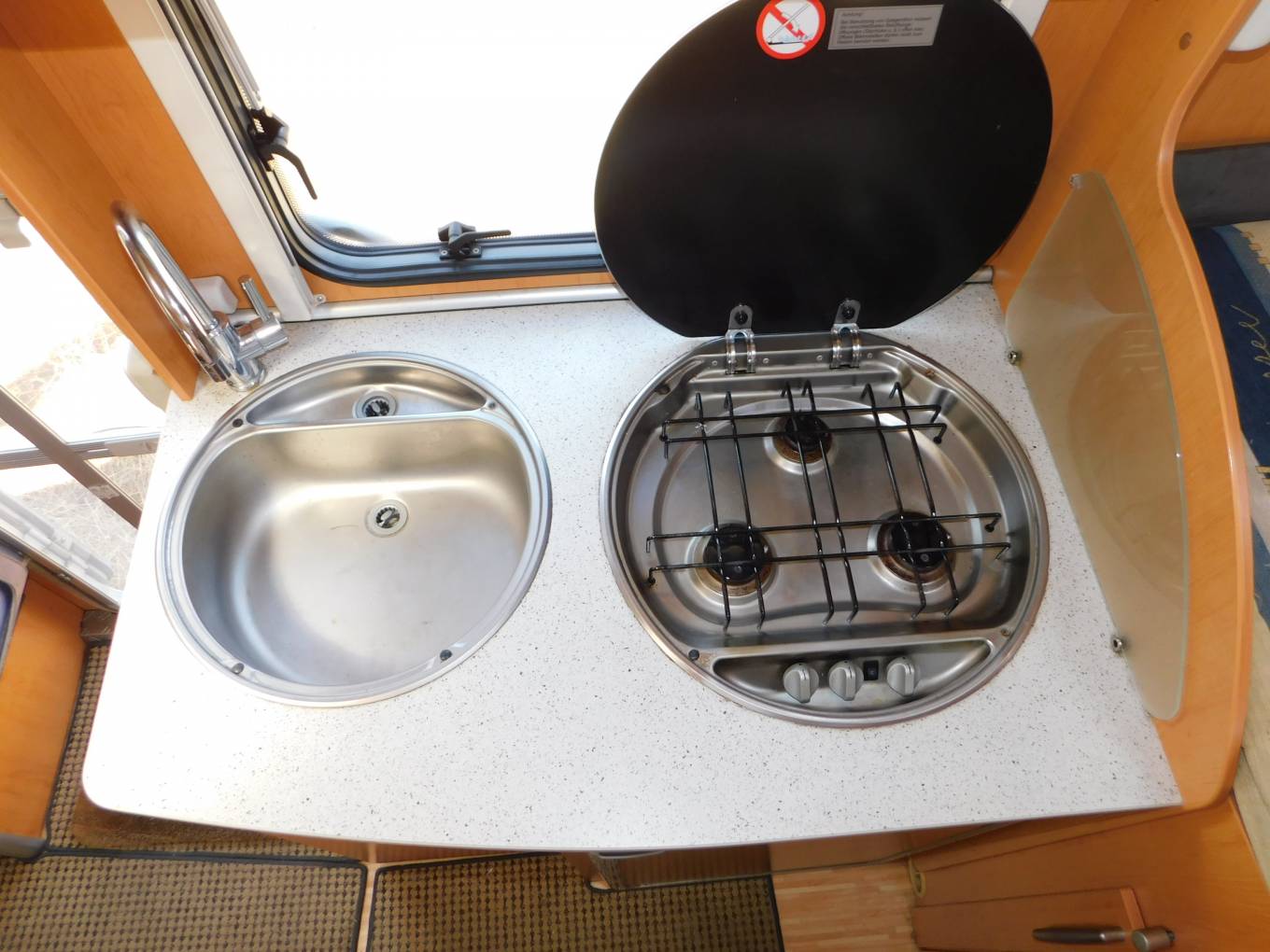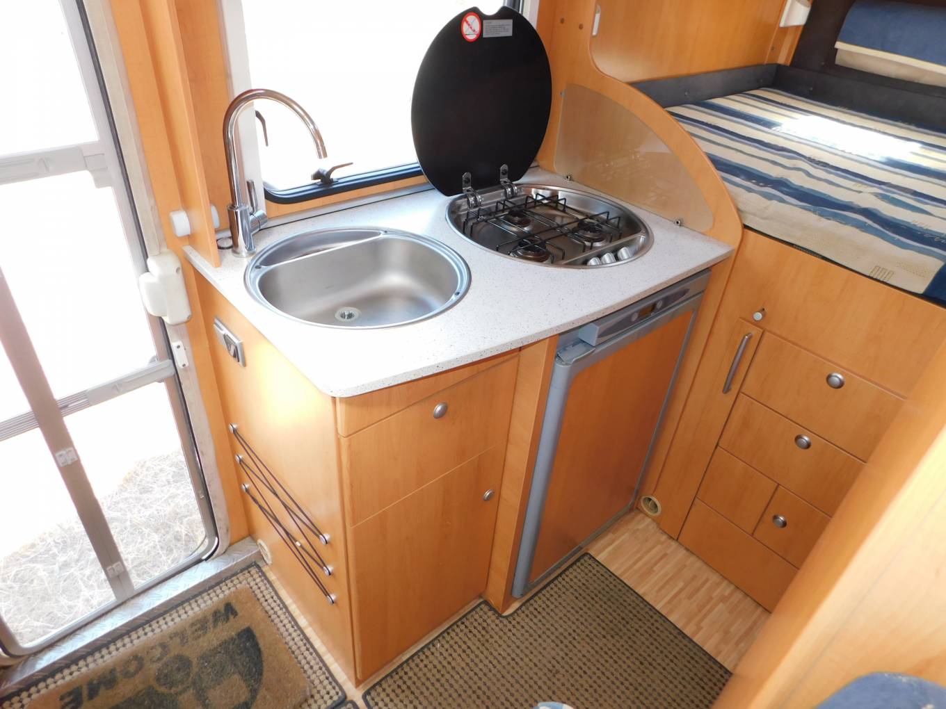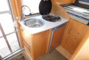 The kitchen has a round stainless steel sink with chrome mixer tap, a round stainless steel hob with three gas burners, a Thetford 3-way powered fridge with ice-box and plenty of upper and lower cabinets to store away your holiday provisions.