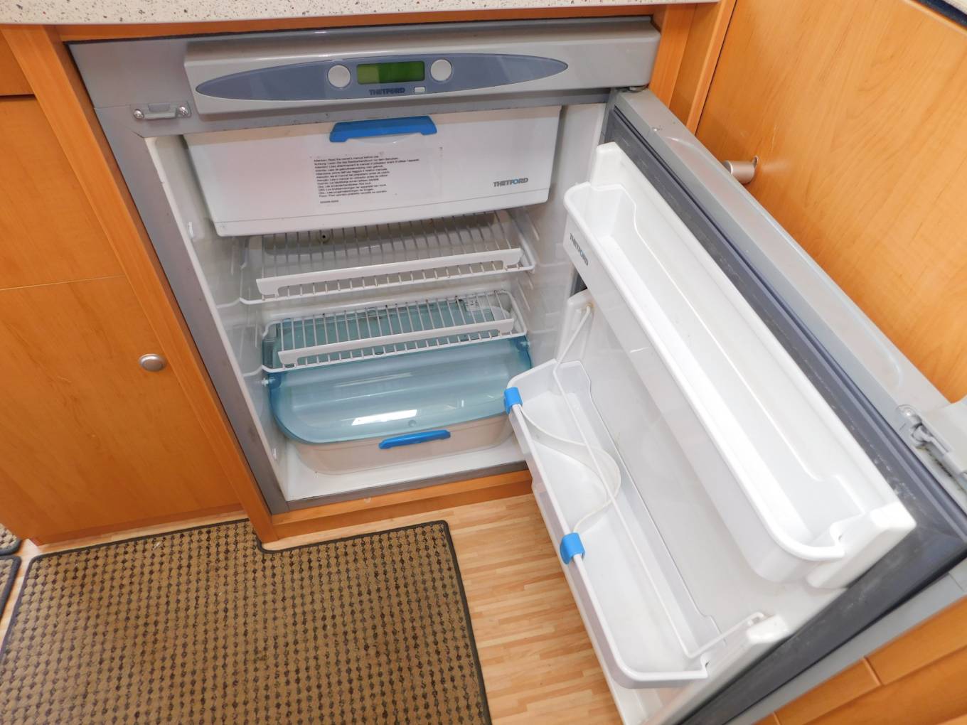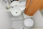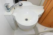 The washroom a sliding privacy door, a wash-basin that utilises the shower head as a tap, there is a clever fold out panel to make up a separate shower cubicle and protects the Thetford cassette swivelling toilet from getting wet, the toilet also has an electric flush. The tap pulls out and can be set into the rising rail affording a good shower, a large cabinet for storage and two mirrors.