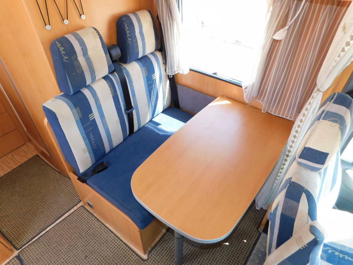 Using the electric step, enter the Hymer and you have the lounge / dining area in front of you, with two forward facing seats that have 3-point seatbelts, so four travelling seats in total and a large dining table with additional swing out section as the two front cab seats swivel to face the dining table. This area makes up into the third berth in the evening utilising the rear seats, dropped table and front passenger seat.