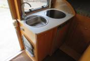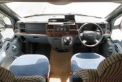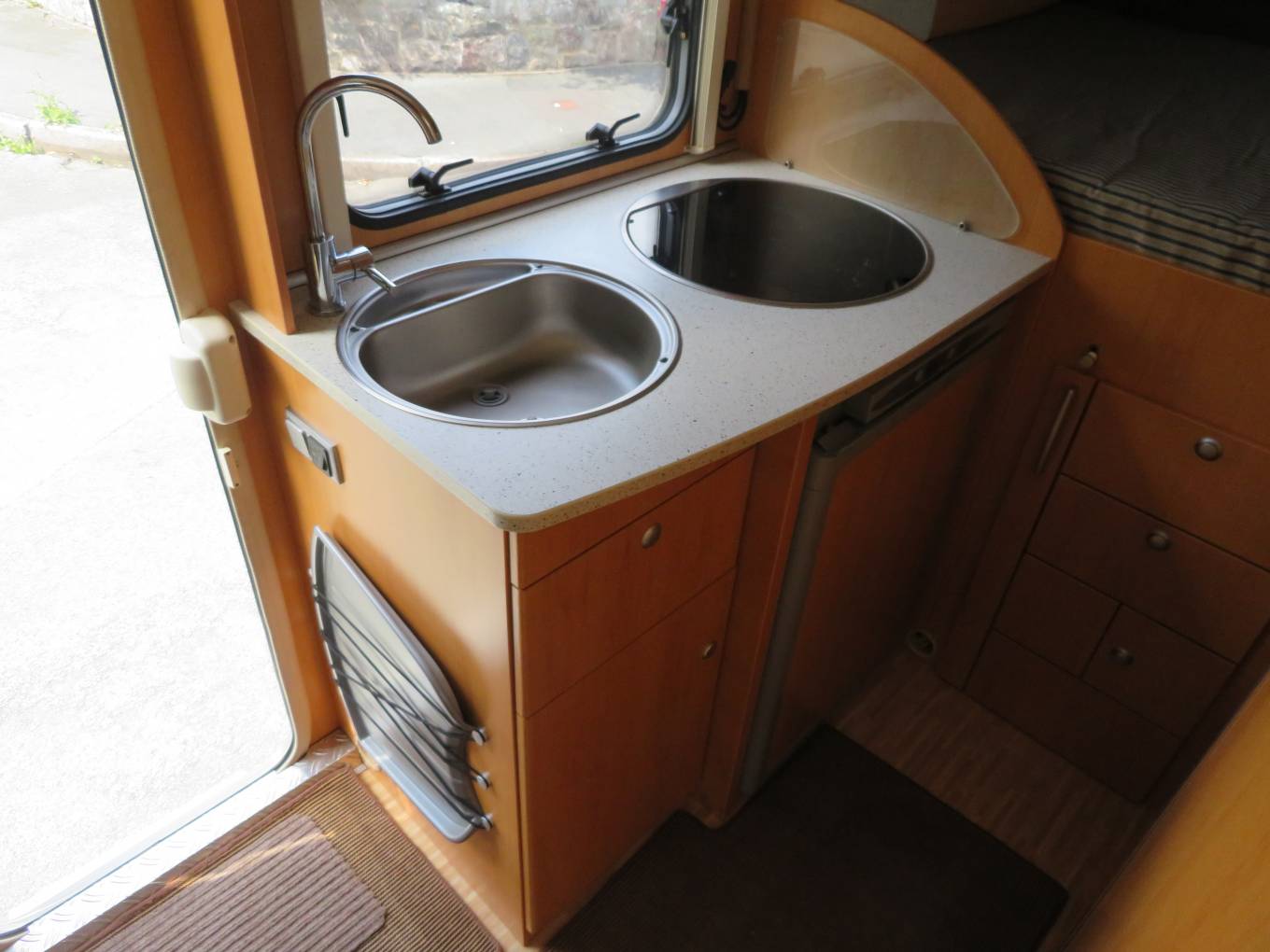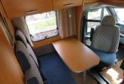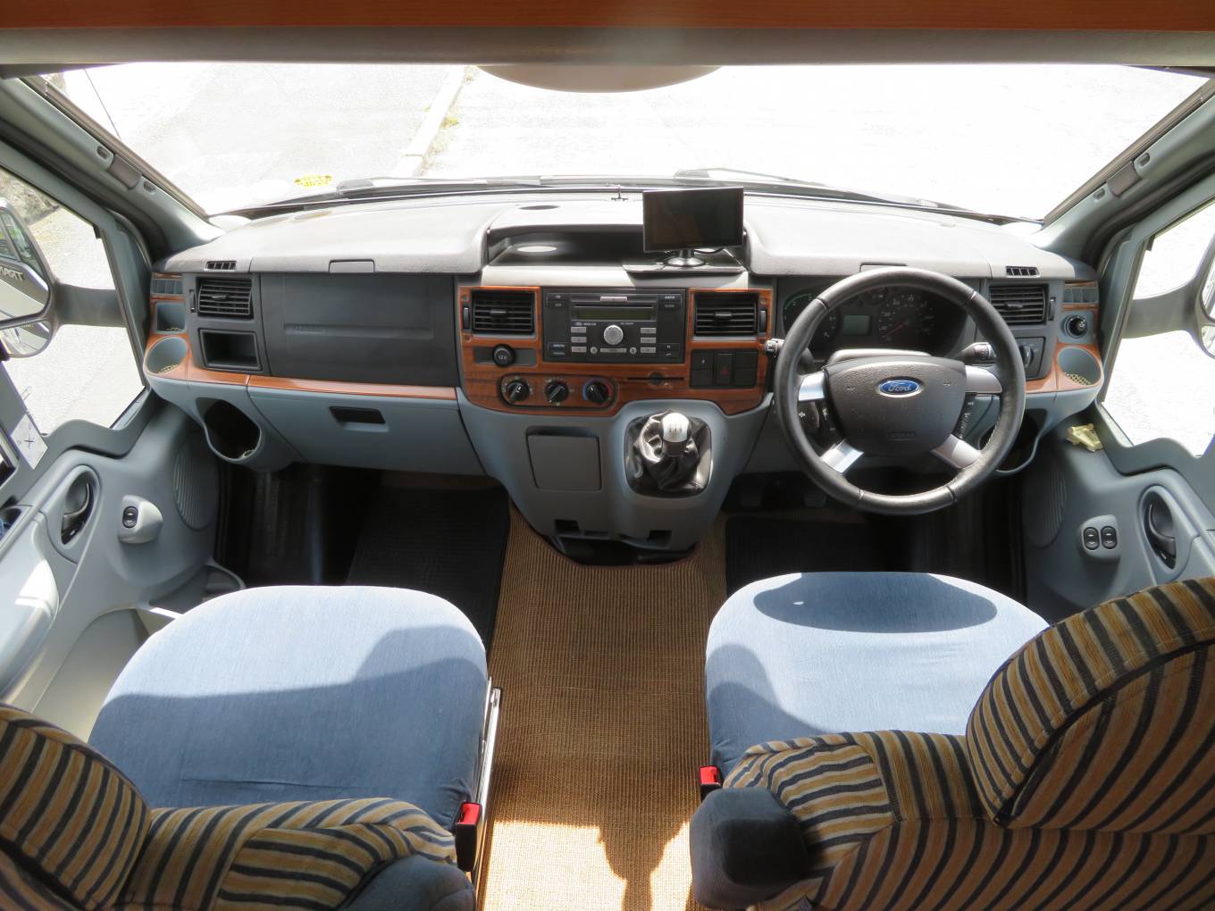 The interior consists of a transverse fixed double bed at the rear, kitchen area with 3 burner hob, sink with mixer tap and fridge with freezer compartment. The front lounge / dining area has two front facing seats complete with seat belts. The two cab seats swivel to allow four to sit at the dining table with an additional swing out section. The washroom consists of a Thetford cassette toilet, shower, sink, mirror and storage cupboard. The sink is swiveled above the cassette toilet area to allow the use of the shower. There is a Truma Blown air system fitted and a Truma water heater. Fly screens and blinds are fitted to all windows.