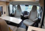 the front is a dinette with side mounted lift up table opposite the swivel cab