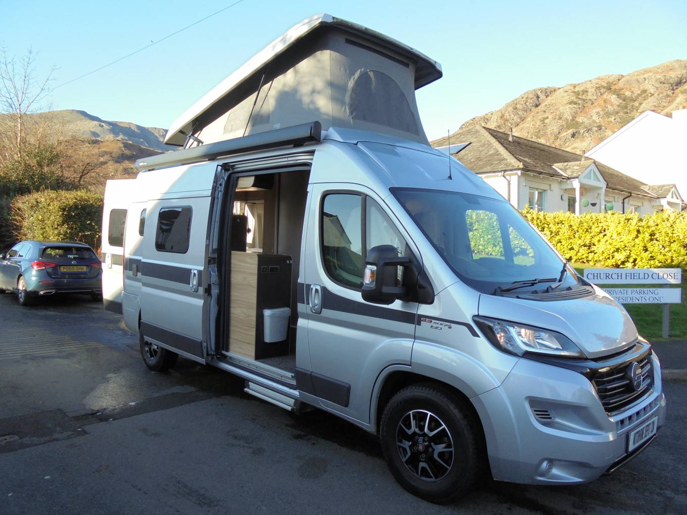This is a 2018 Hymercar Grand Canyon, in beautiful condition with one owner from new and just 5,997 miles on the clock. This is a 4 berth van canversion by Hymer and it comes with all the high quallity and inovation you would expect from Hymer. At the front is the lounge and dining area with 2 captains seats, in the centre of the van is the kitchen and bathroom and at the rear is a seating and storage area that makes into a double bed. When the roof is raised there is a futher full sized double bed with ladder and large access hatch. It comes with 4 seat belts, hab air con, cruise control, rear camera, blown heating, DAB radio, bluetooth, sat nav, tow bar and Cat 6 tracker. A superb camper, ready to go, call for more photos and information.