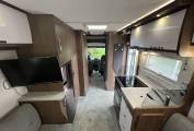 The large garage at the rear, will easily store bikes if required, above which is the rear U shape lounge. There are 2 travelling seats below the sofas, so 4 people can travel safely. The electric drop down bed can sleep 2 people.