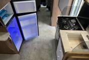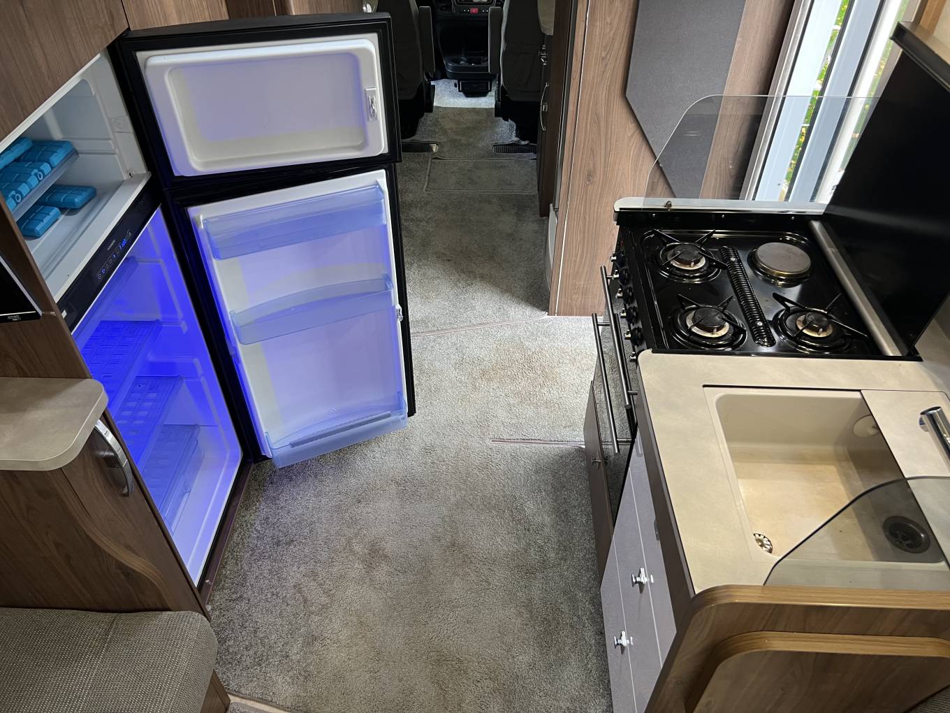 The kitchen has a modern feel to it, with large Dometic Tec Tower fridge with freezer, sink, 3 burner gas hob and oven with grill.