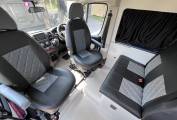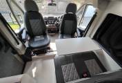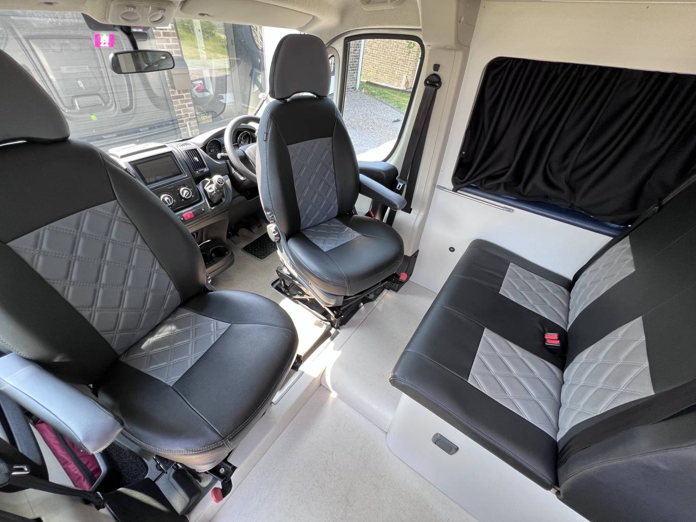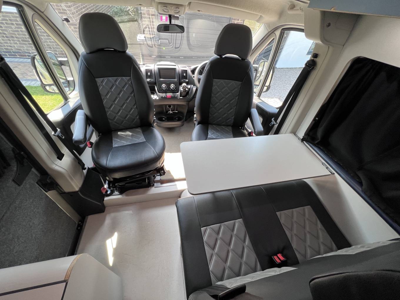 Both Cab Seats swivel round to face the rear Twin Belted Seats with a removable side mounted dining table in place when required.