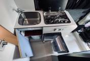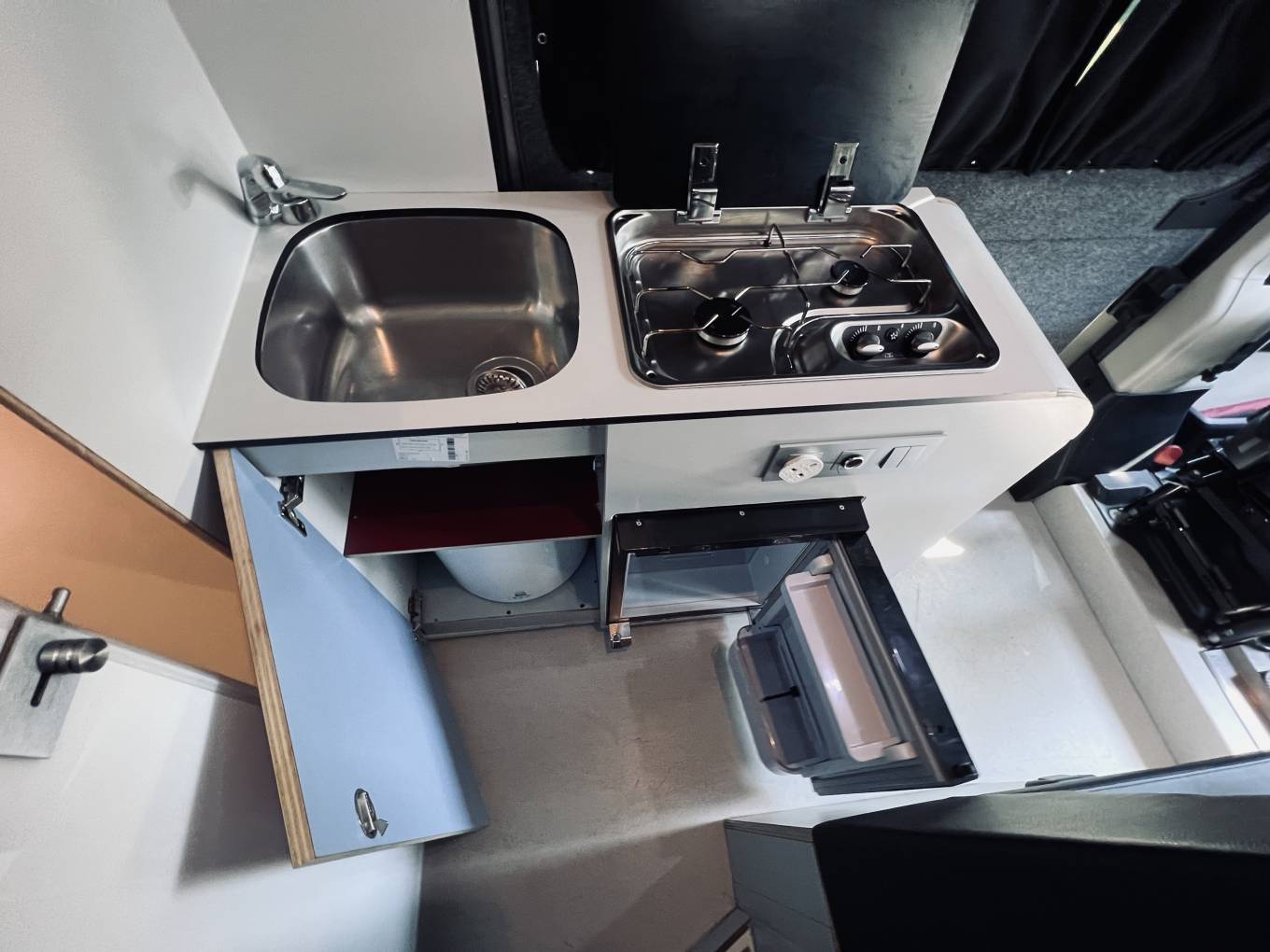 Inside the large sliding side door is the kitchen area consisting of a twin burner hob, a sink with hot and cold water and a 12 volt fridge.