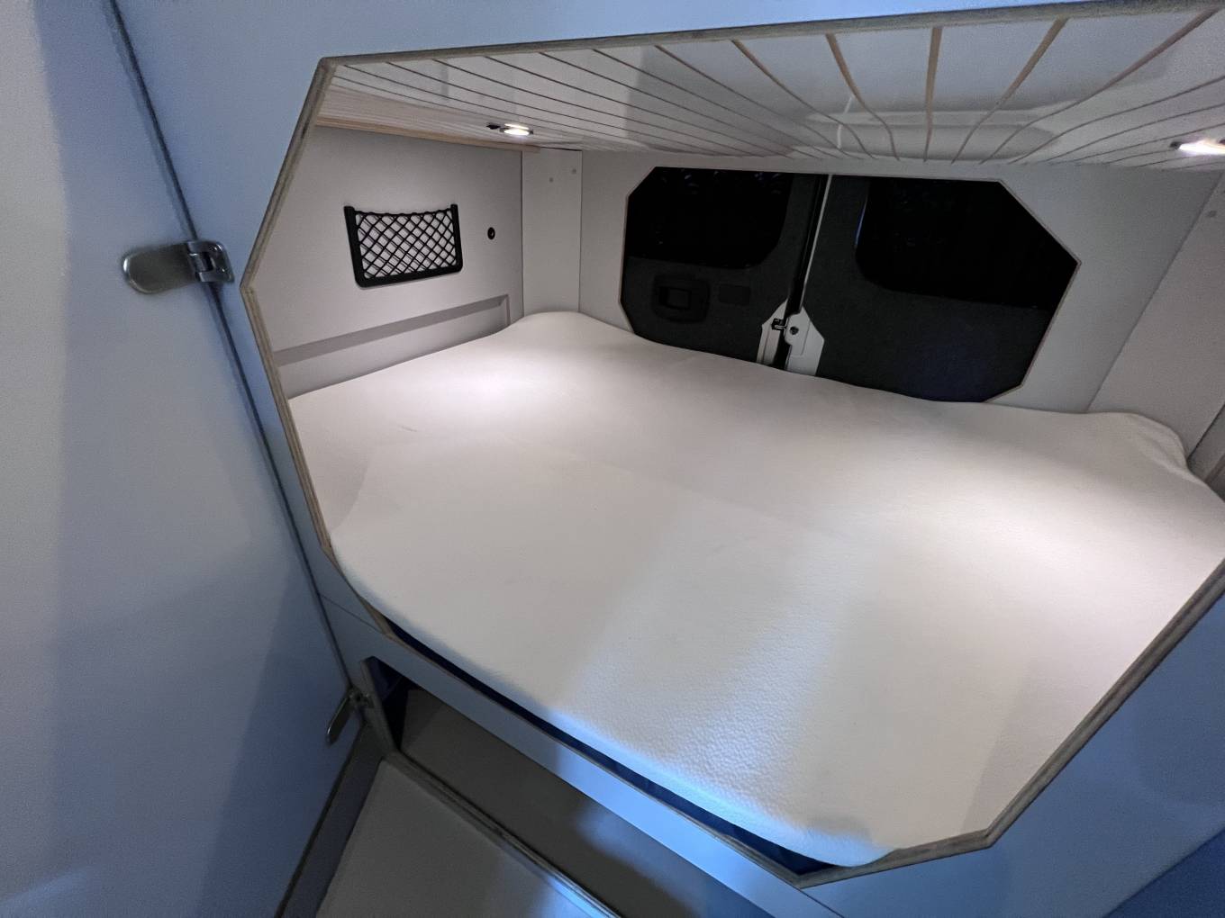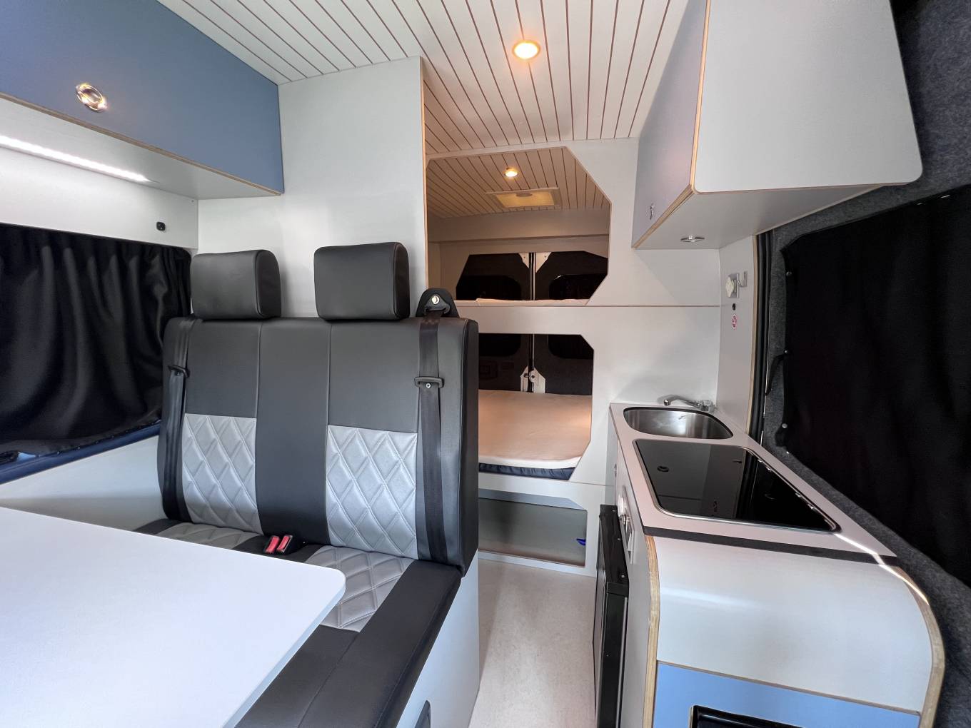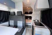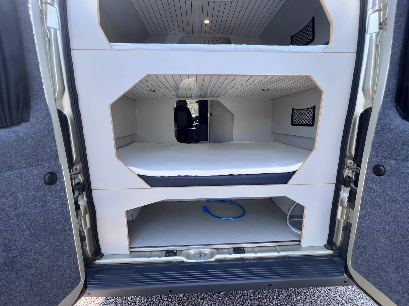 Across the rear are two large fixed double beds with storage below the lower bed accessible from both inside and outside the campervan.