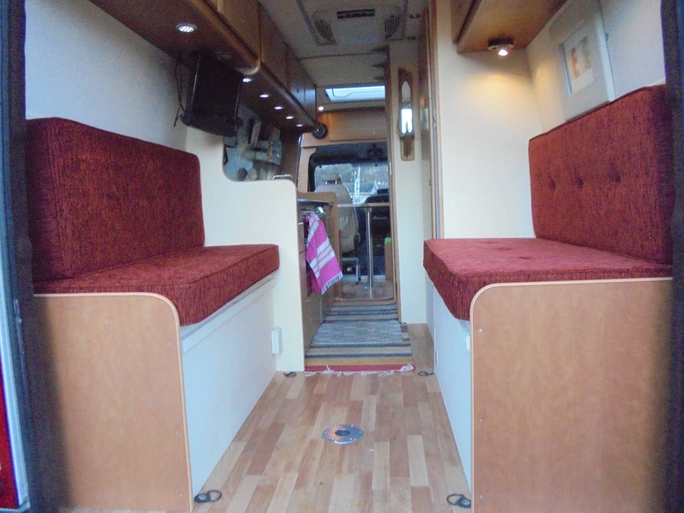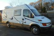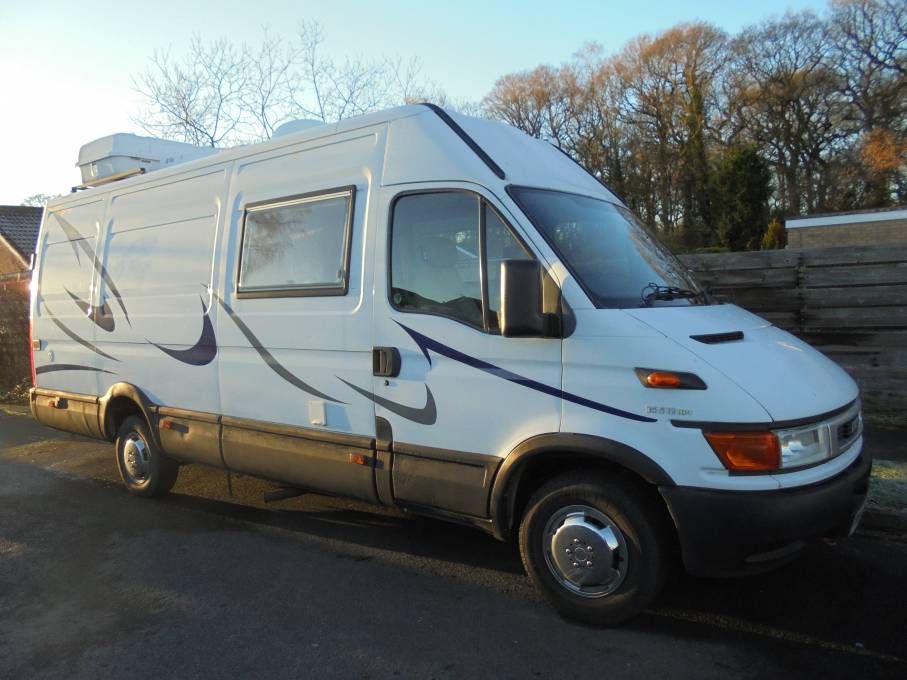 Call with any questions 01423 5609985. This is an Iveco daily that has been self-converted, it has travelled 135455 miles and has a MOT until May 2019. It has had 3 former owners and was first registered in August 2003, it is built on the Iveco chassis it measures approximately 22ft long and is approximately 7.5ft wide. This would suit a young couple or someone looking for a motorhome that will enable them to stay for extended periods for fishing or something similar as there is plenty of storage space for lots of equipment. It has lots of extra equipment fitted and the total spend of the conversion itself runs to between 18500 and 19000 pounds. It is well appointed, on top there is a roof box, satellite dome and air condition unit for the habitation. Externally there is also a tow bar and gas BBQ point. Internally at the rear you will find a bed which measure approximately 4ft x 5ft 11inches, this neatly can become a rear lounge with 2 bench seats which are 4ft long and these can be used to full enjoy the views as the back doors open fully reaching right round to the sides of the van. as you move forward from the lounge there is a galley style kitchen with a Smev oven and grill, 2 gas burner ring stove and sink. Throughout there is plenty of storage above floor below and above head height. There is a large hanging wardrobe and forward of this you will find the washroom. The washroom includes a fixed toilet, shower attachment and sink. Behind the driver’s seat is a small lounge area with a table and above is the control panel for everything. Upfront there are 2 Saab seats, the drivers seat has memory positions, the passenger seat electrically moves into any desired position, it has a 5-speed manual gearbox, radio/CD with USB and power steering. Other additional features of the van include the blinds on every window and silver screens for the front, parking sensors, reversing camera, pioneer sound system, air dispatcher diesel heating which heats the water and provides heating for the habitation, there is a gas bottle for the cooker, camos satellite system and approximately 6ft of headroom throughout the motorhome. Nice little touches include the spotlights throughout and stainless-steel finish as splash back across the whole of the galley range. This is s a nice conversion and one of the best we have seen and can be viewed in York. . Part Exchanges welcomed on this vehicle, for further information and photos please call us on 01423 609985 quoting Reference 88499.