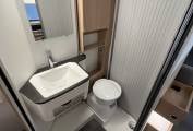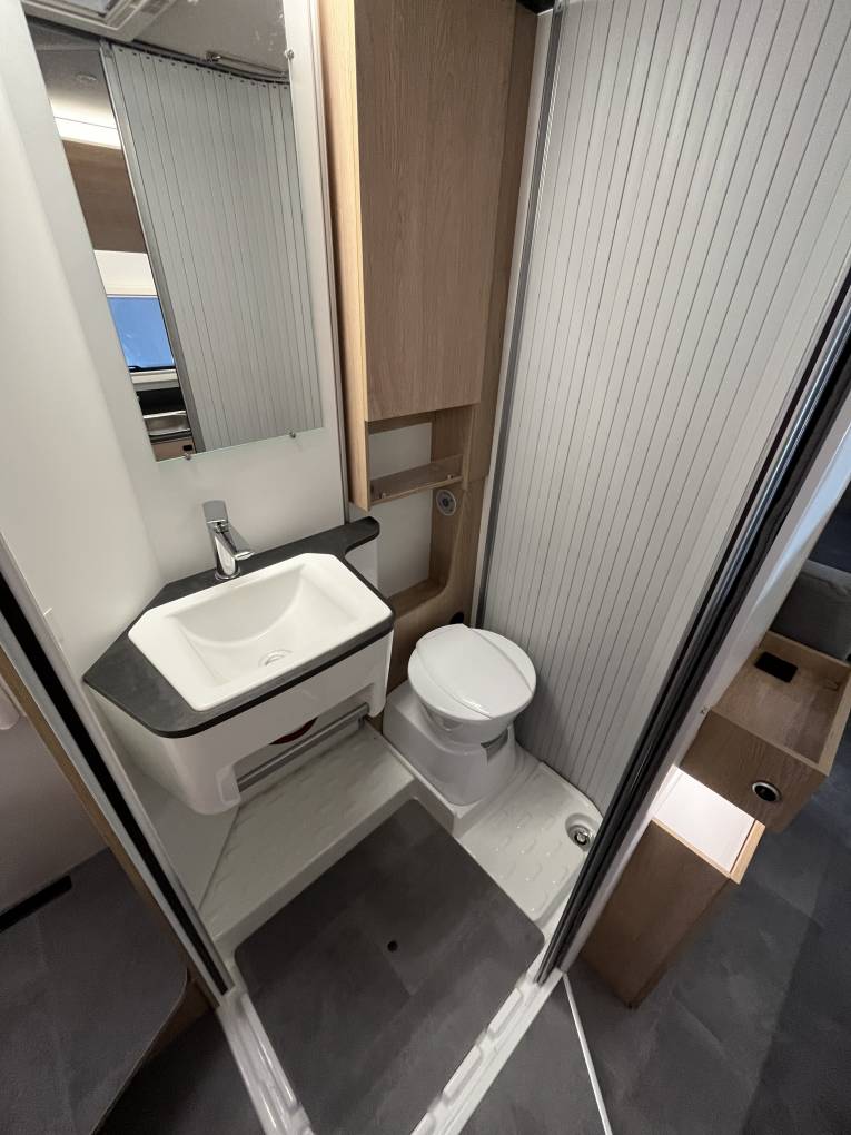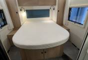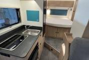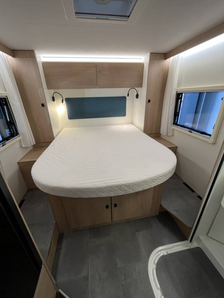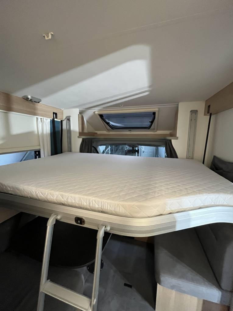 The motorhome benefits from a large fixed double bed at the rear and an electric drop down double over the front dinette, making it a lovely place to sit, relax and sleep. Having all the comforts of home, it feels lovely and cosy with the Truma heating system (mains or gas), and with a well insulated habitation area, it really is an all year round motorhome.