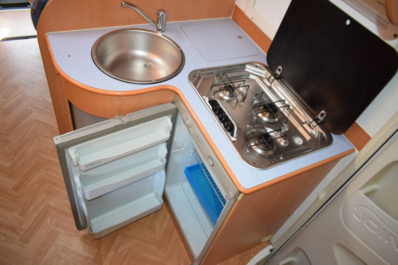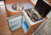 The kitchen is to the immediate right of the entrance door and consists of a three burner hob, a sink and a three energy source Dometic fridge.