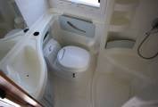 On entering via the caravan door, to your left at the rear of the motorhome is the bathroom consisting of a Thetford swivel toilet, wash handbasin, a semi separate shower and plenty of cupboard space.