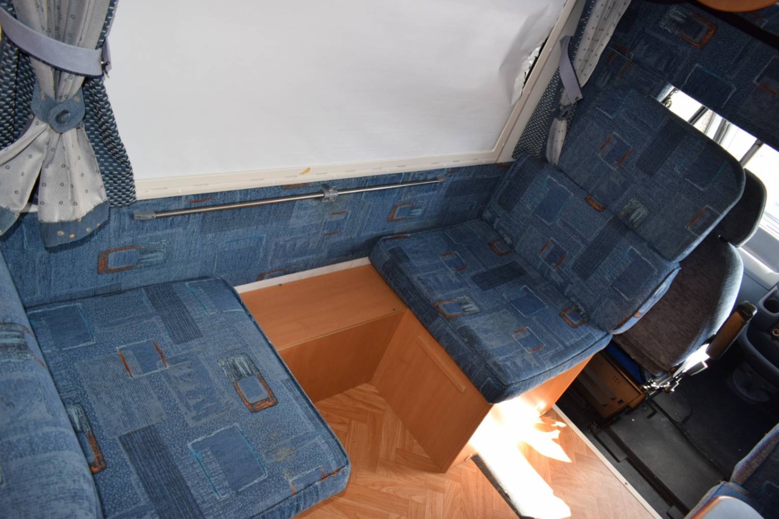 Across the centre of the motorhome on the driver’s side is a four person dinette which converts to a double bed and on the other side two single seats facing each other which convert to another single bed.