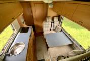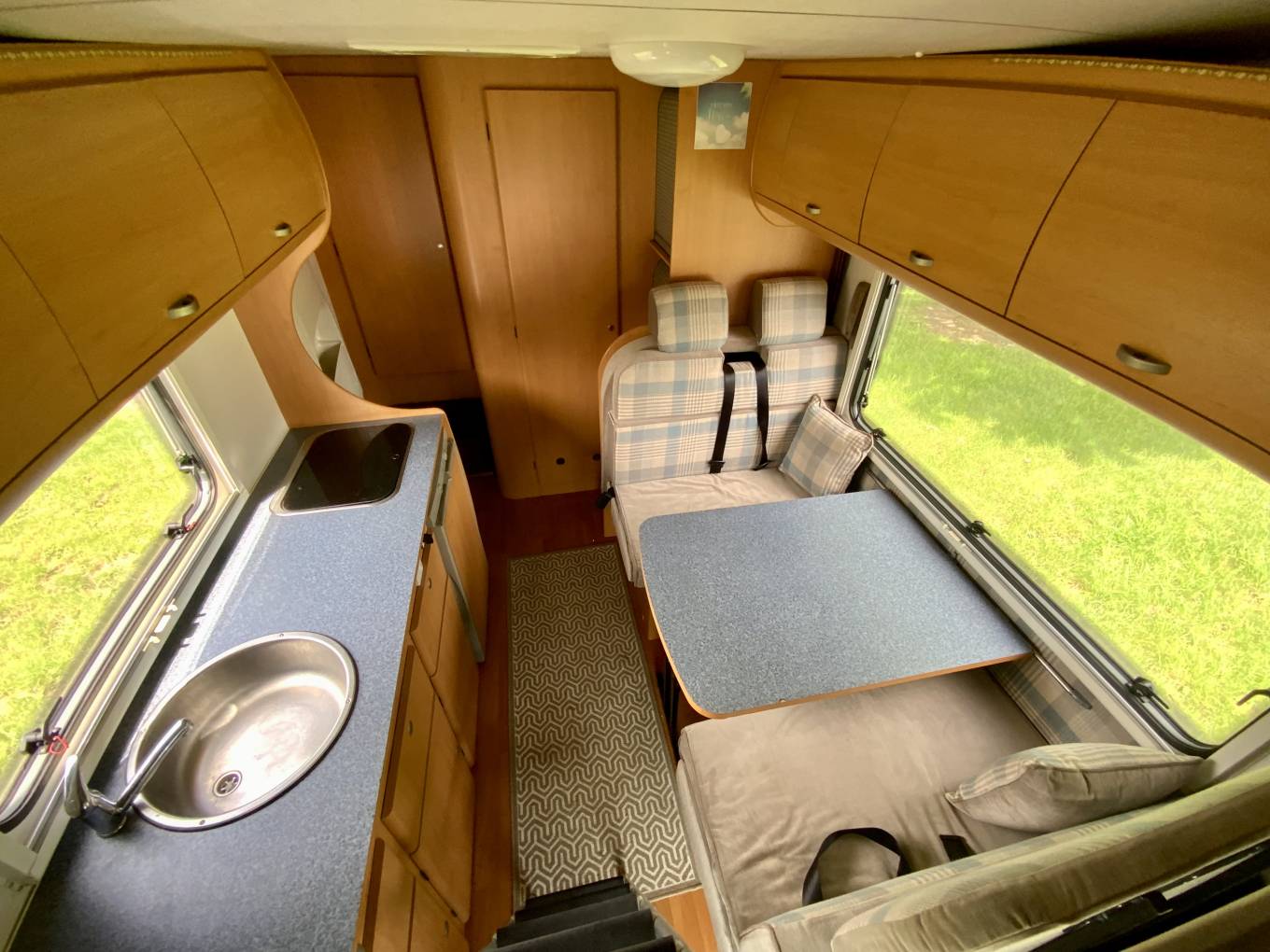 Starting at the front there is a large bed over the cab which can easily accommodate two adults. In the centre of the vehicle is a light and airy dinette area that converts to another smaller double and also features four seatbelts, two of these are three point. Opposite the dining area is a large well equipped kitchen with an abundance of storage along with a good sized fridge with freezer compartment, a gas hob and sink with mixer tap. To the rear is a spacious washroom with a separate shower cubicle, cassette toilet and hand wash basin. Next to the washroom is a generous sized wardrobe.
