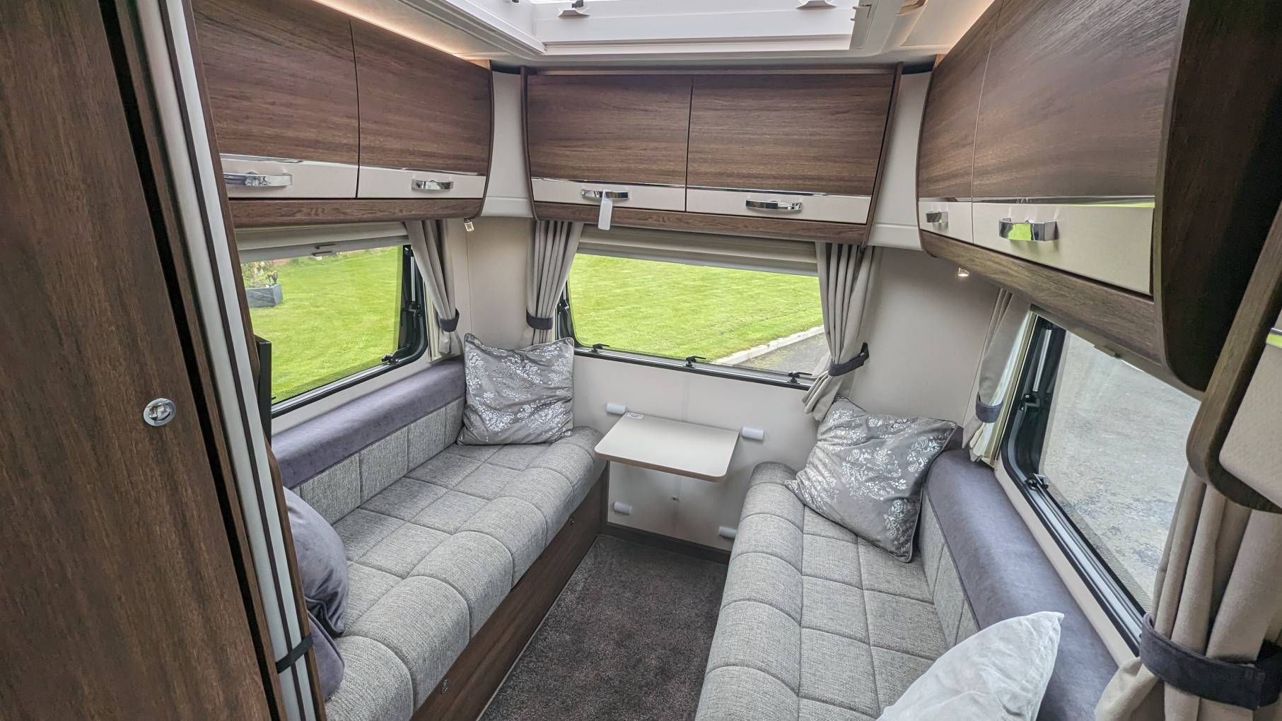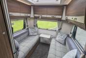 The large washroom with cassette toilet and mixer tap provides all the comforts of home, while the large fridge freezer and 3 gas ring burner with electric hob make meal times a breeze. The oven is perfect for those who love to cook, and the blinds ensure privacy and comfort.