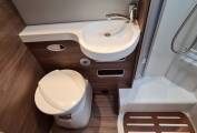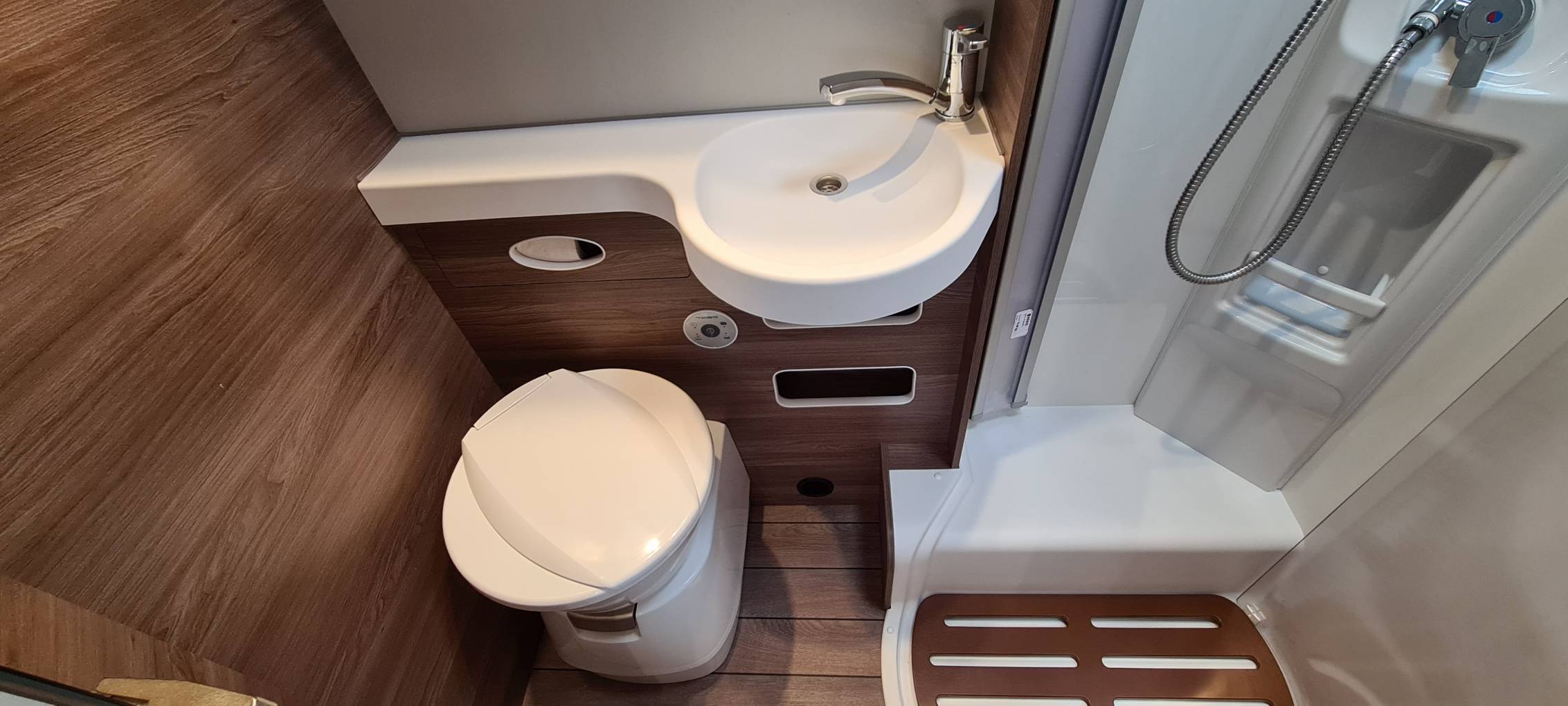 area you will find the wash room. A large separate shower, vanity sink and Dometic