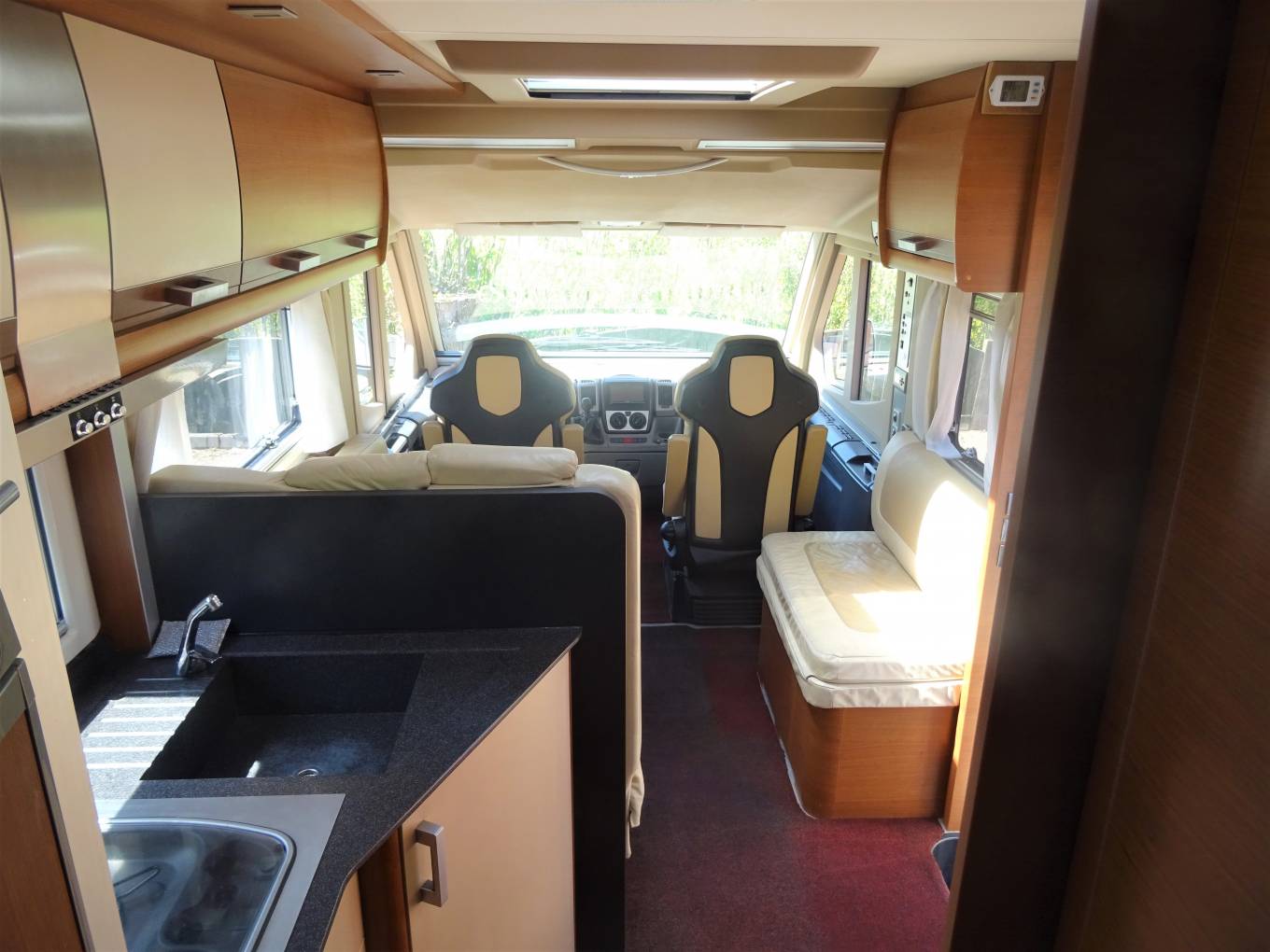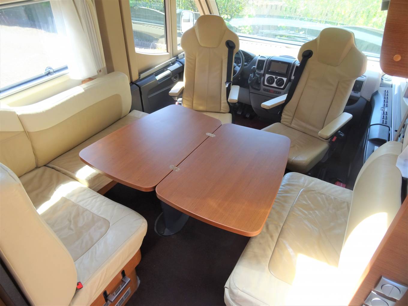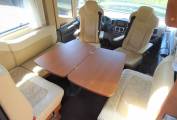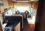 Opposite this area is the second large flat screen TV which faces the centre dinette. As we come to the lounge/dining area where there are the rear two travelling seats as apart of a L shape sofa with a further 2 seats adjacent to it. At the front there are driver and passenger seats that both swivel to face the large dining table that is positioned in between that offers that warm family dining experience. Above the cab is the second spacious double bed that pulls down over the front two seats which are folded right down.