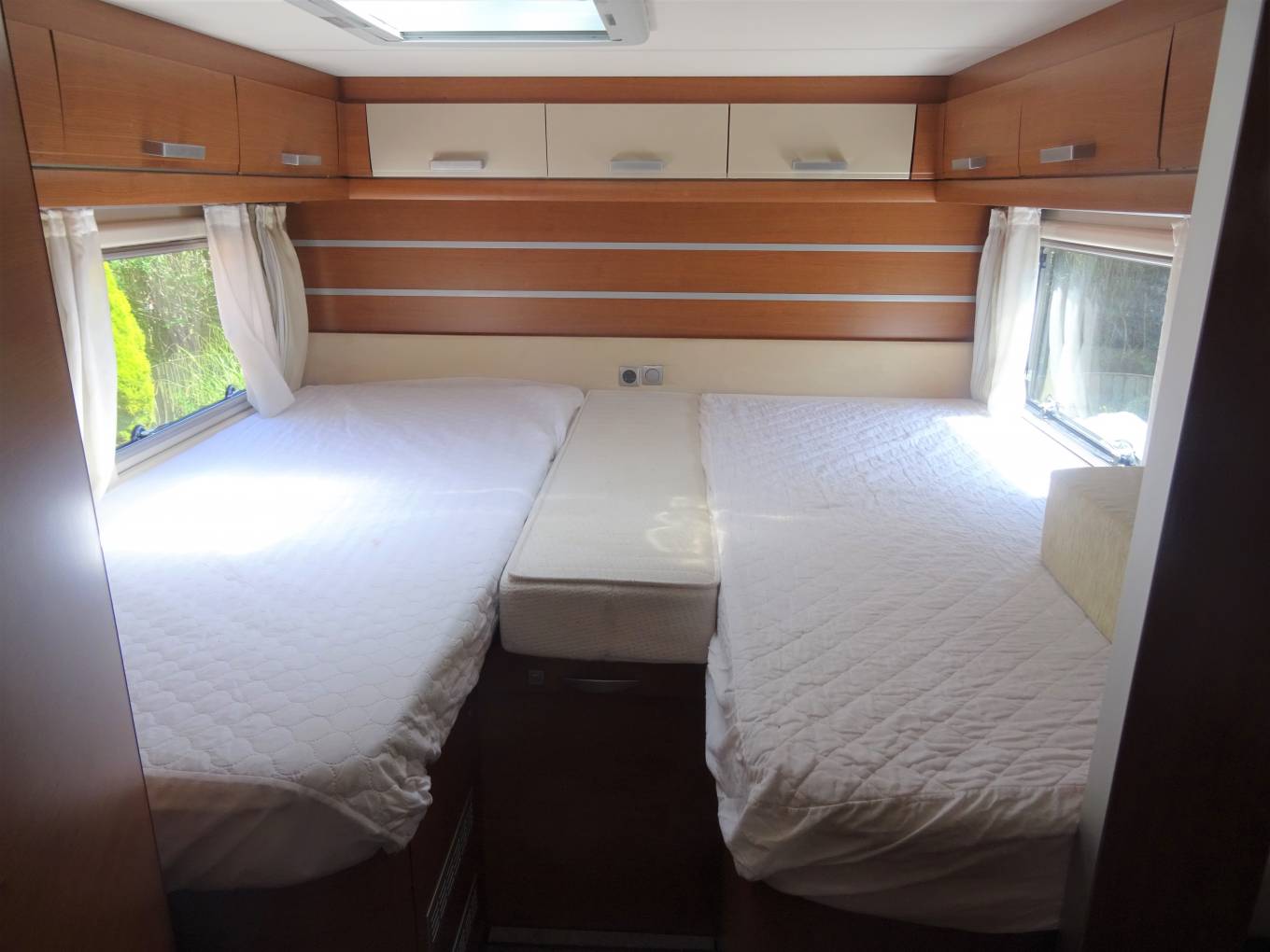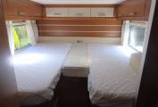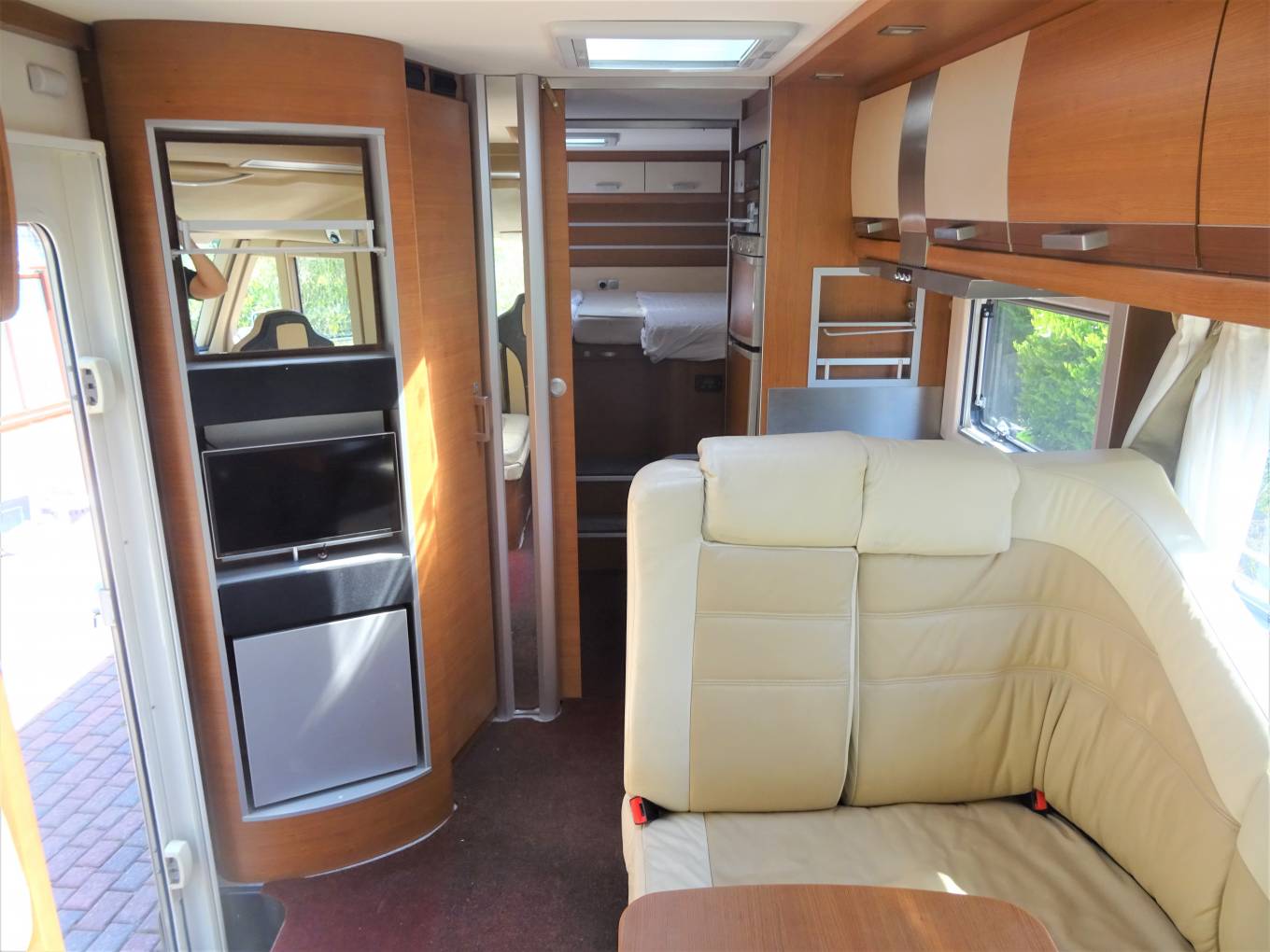 Starting with the rear of the motorhome, you have a large fixed elevated double bed which can also be used as two singles surrounded by multiple spot lights with plenty of storage space in the overhead cupboards. There is also a flat screen TV.