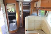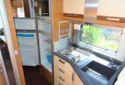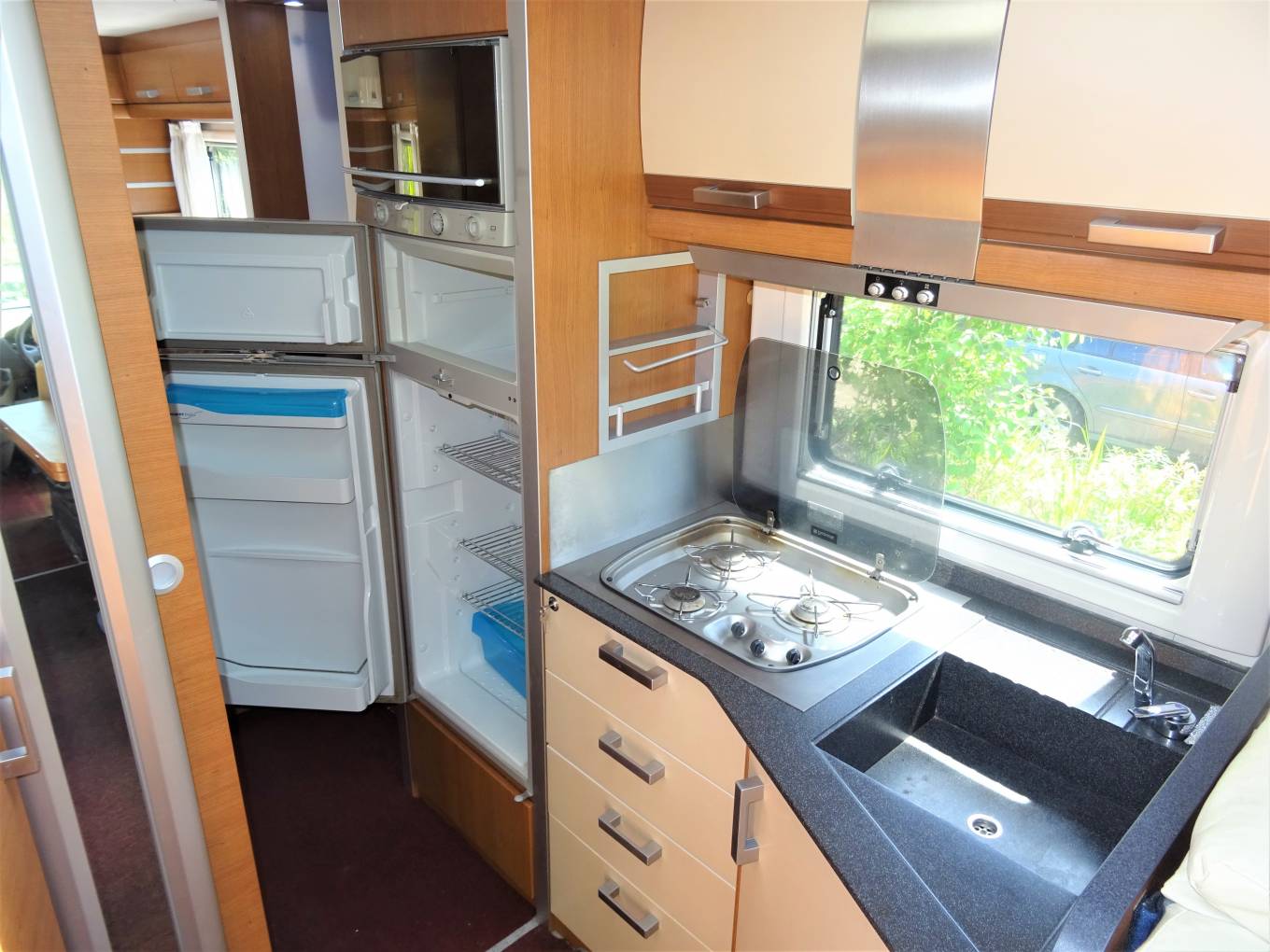 Carrying on through the motorhome, we come to the kitchen area where there is a 3 ring gas hob supplied from the refillable gaslow system located in the exterior storage unit. Next to the cooker is the sink with mixer tap along with a full height fridge with freezer compartment and above is the mini oven/Grille.