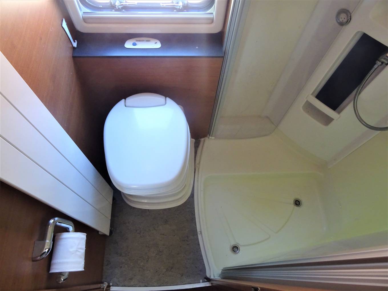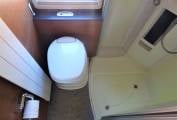 Moving through to the centre of the motorhome, There is a large washroom that can be closed off from the centre dinette to offer much needed space and privacy. This includes a spacious full length separate shower, wash basin with mixer tap, cupboards and a separate Thetford toilet with further storage units.