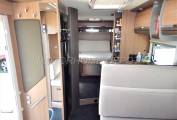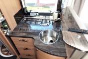 Moving rear the L shaped kitchen consists of: round sink with chrome mixer tap; 3 gas burner hob with hinged glass top; there is plenty of drawer & cupboard space above and below the counter for all your holiday provisions. Opposite is a Tec tower; a large 3 way fridge with separate freezer box that can be powered by 240v; 12v or gas depending whether you are plugged in on site or wild camping. The oven and grill is situated on top.