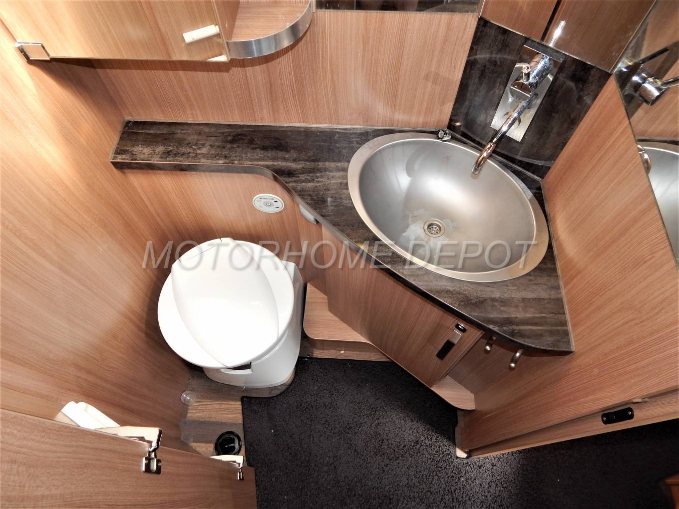 The bathroom is split with the toilet washroom on one side and a separate shower cubicle on the other. The door can close of the habitation area giving a private area to get dressed or close off the toilet area. This has a canny design that the wall can be extended to give extra space. The toilet is a Dometic cassette style with a swivel head and fresh water flush. Above is a built in sink with chrome mixer tap. The area gives a feeling of space with plenty of mirrors there is also plenty of cupboard space.