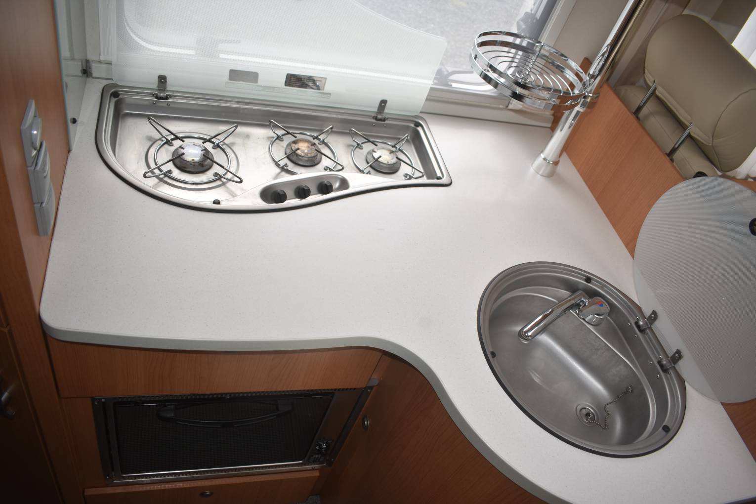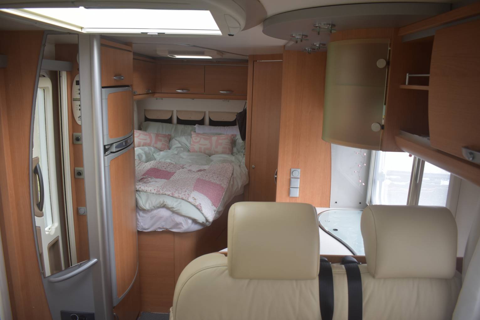 Knaus are high quality German-built motorhomes and the 650, consists of 2 Captain Chairs which swivel to form a dining area with the rear seats and bench area. This is a very sociable area with plenty of natural light from twin sunroofs and cab and side windows. The dining area forms a bed at night. To the left of the habitation door is the kitchen with hob, oven, grill, sink, large refrigerator and separate freezer and plenty of storage cupboards. Moving to the rear is a large wardrobe and washroom with sink, w/c and separate shower cubicle. Then one of the major features, a fixed French bed with a range of overhead lockers and storage beneath. There are LED lights throughout the motorhome as well as black-out blinds and fly screens. Other features include, heating, awning, satellite system, cab air conditioning, reversing camera and bluetooth.