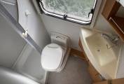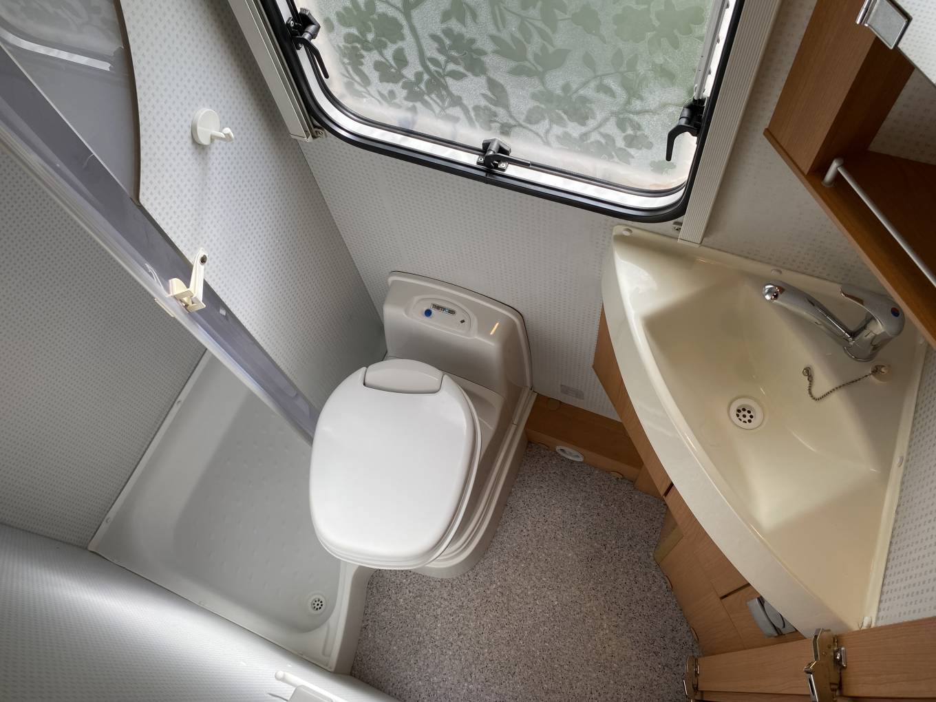 shower with screen, vanity washbasin with a chrome mixer tap, a swivel Thetford