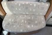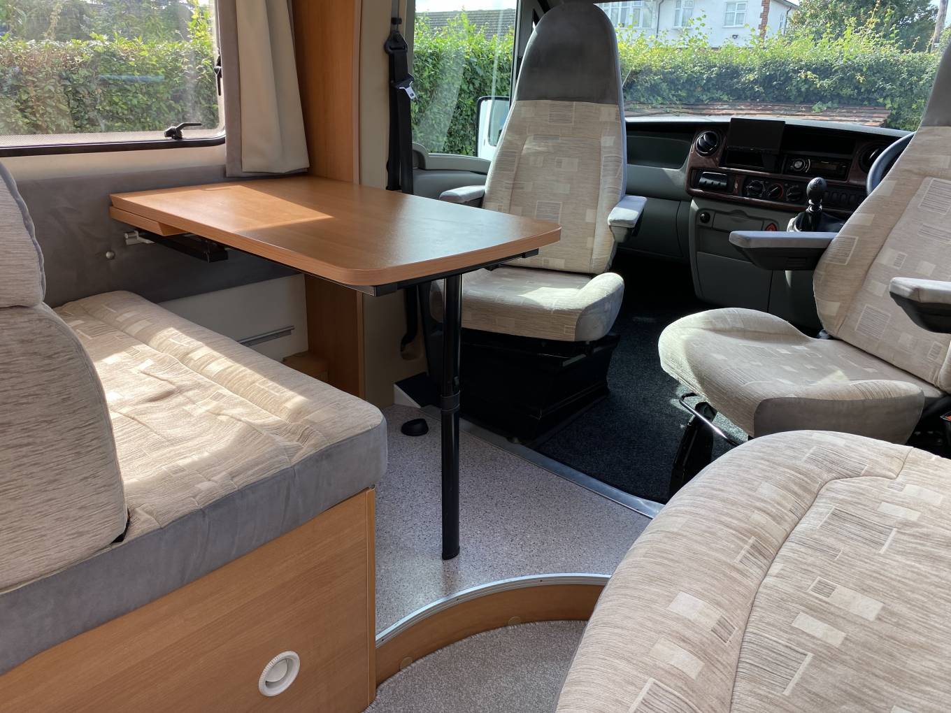 a side-facing sofa and a table that extends in order to provide space for those in the side-facing seat and the driver’s swivelled seat. Panoramic