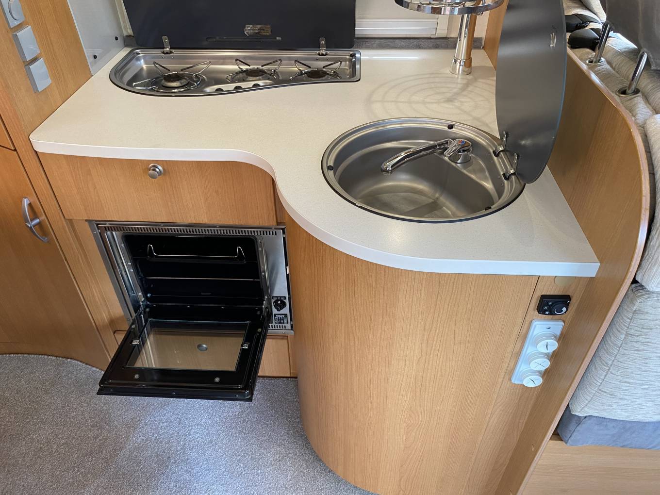 burner hob and below a Smev combination grill and oven, there is a Dometic