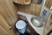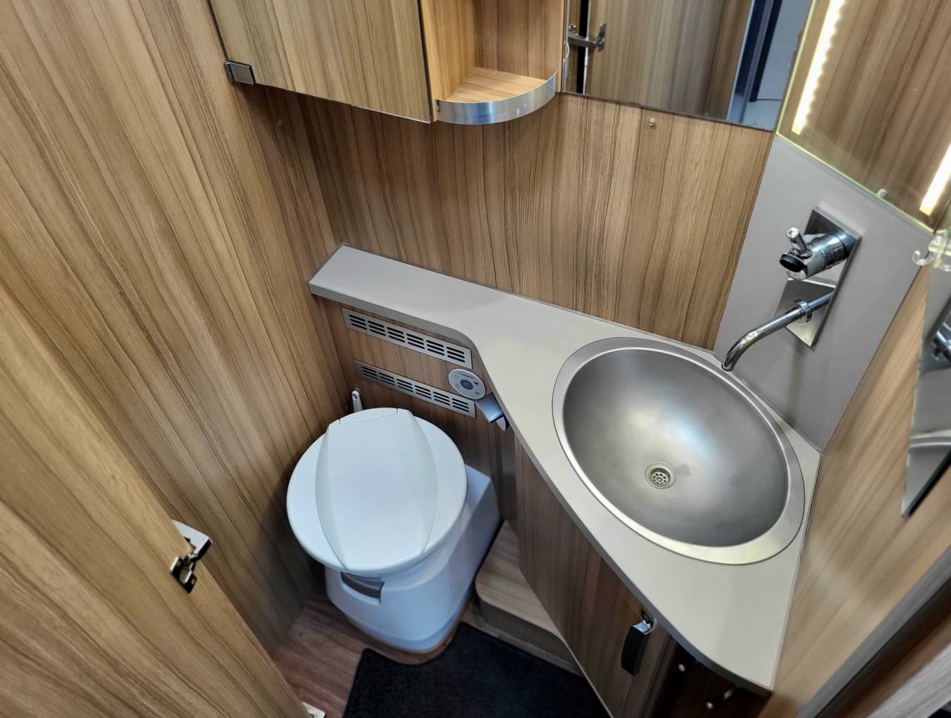 Washroom/Shower -- This works as an en suite to the bedroom as the door to the washroom can be closed off to the rest of the van, so you can freshen up in private. The washroom houses the cassette toilet, vanity mirror with hand wash basin and storage cabinets. Adjacent to this is the separate shower, which is generous in size and modern.